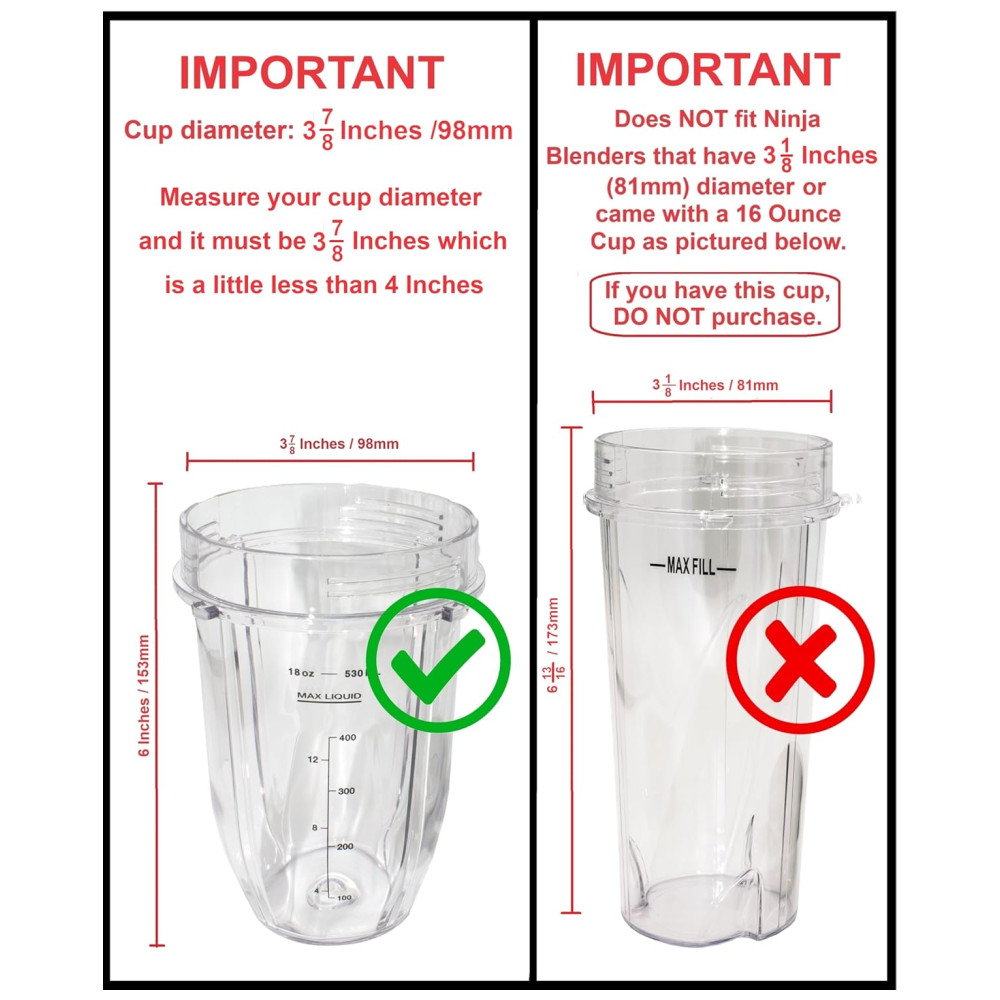 Para garantir que estes sejam os copos corretos para o seu liquidificador, preste mais atenção aos tamanhos nas imagens e na descrição. Estes copos têm 9,84 cm de diâmetro. Meça o diâmetro do seu copo e deve ser cerca de 9,84 cm, que é um pouco menos que 10 cm. Não serve para Liquidificadores Ninja que tenham um diâmetro de 7,94 cm ou que vieram com Copos de 473 ml. Por favor, veja todas as imagens para referência de tamanho e compatibilidade.