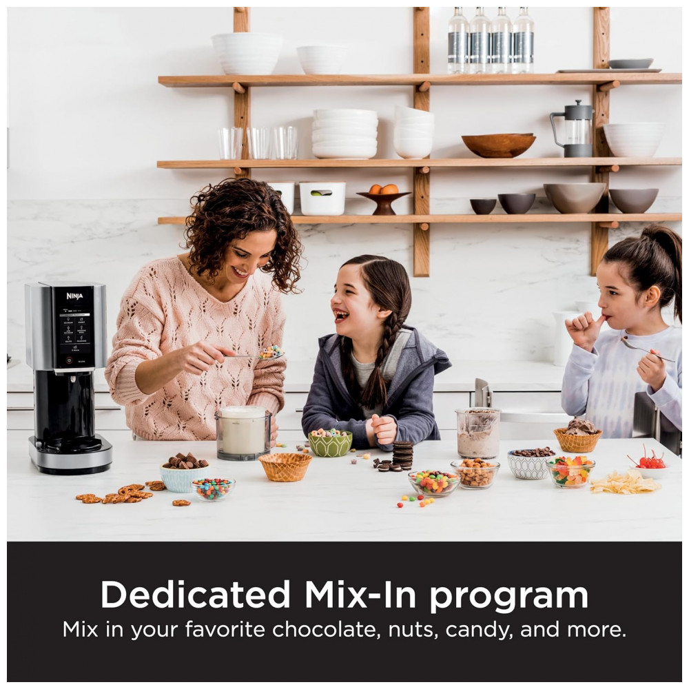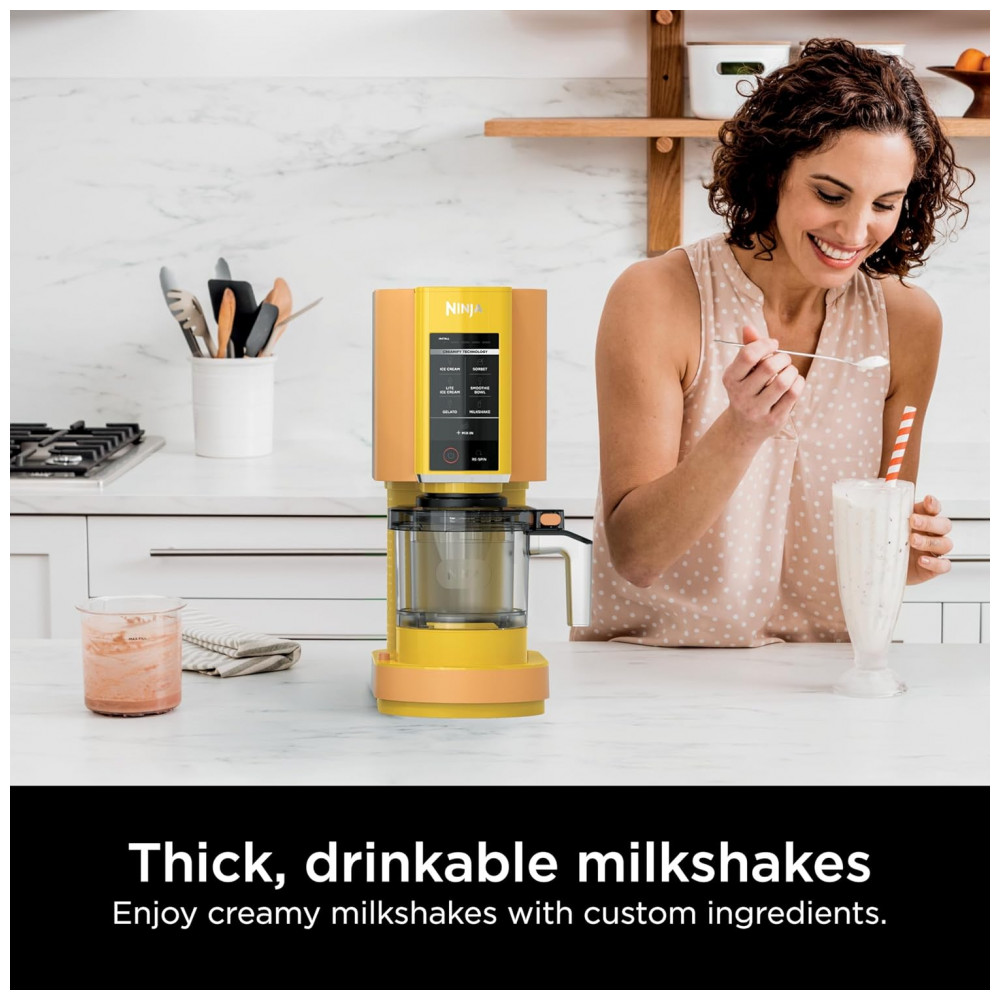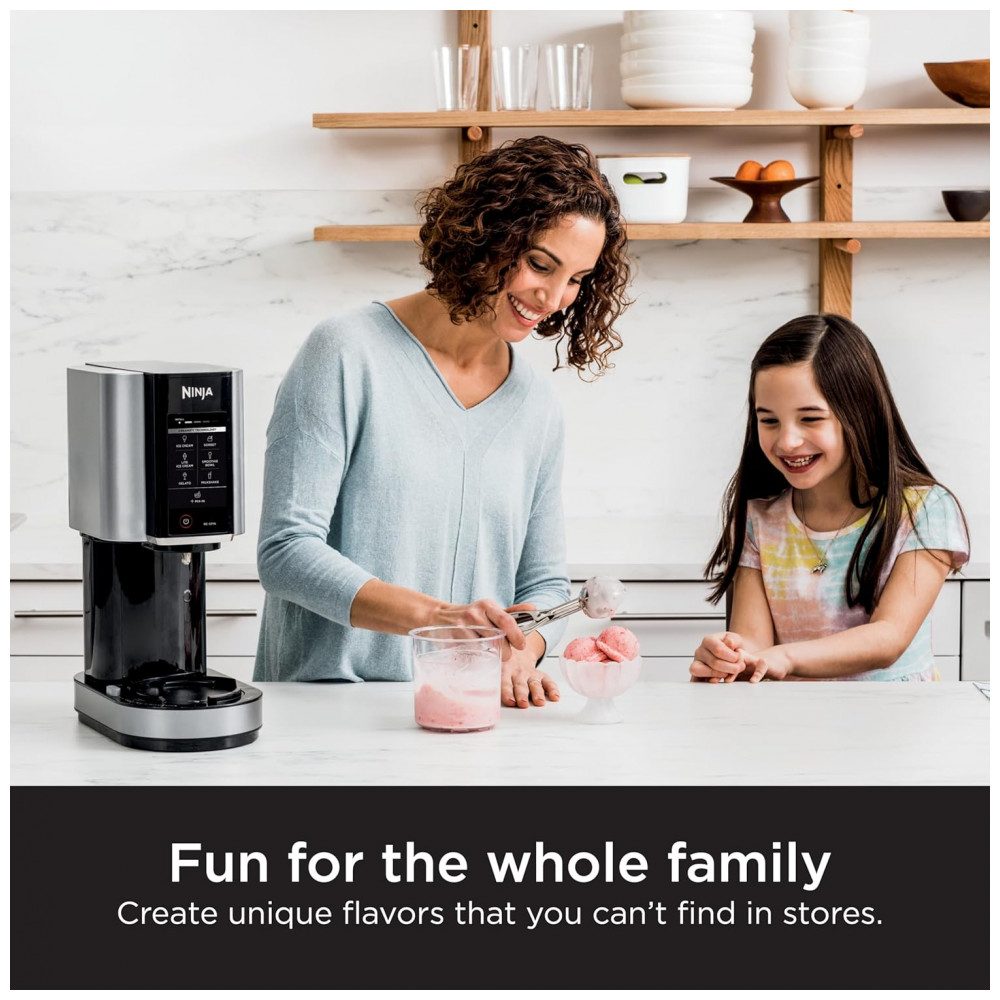 A Ninja CREAMi NC301AO é uma máquina de sorvete automática que transforma ingredientes congelados em sorvete, gelato, milkshakes, sorbets e smoothie bowls. Conta com 7 programas de um toque para diferentes texturas e preparos: sorvete, gelato, milkshake, smoothie bowl, sorbet, sorvete lite e mix-in. Possui tecnologia Creamify para criar textura cremosa moendo uniformemente o bloco congelado, e função Re-spin para deixar os tratamentos processados mais suaves.