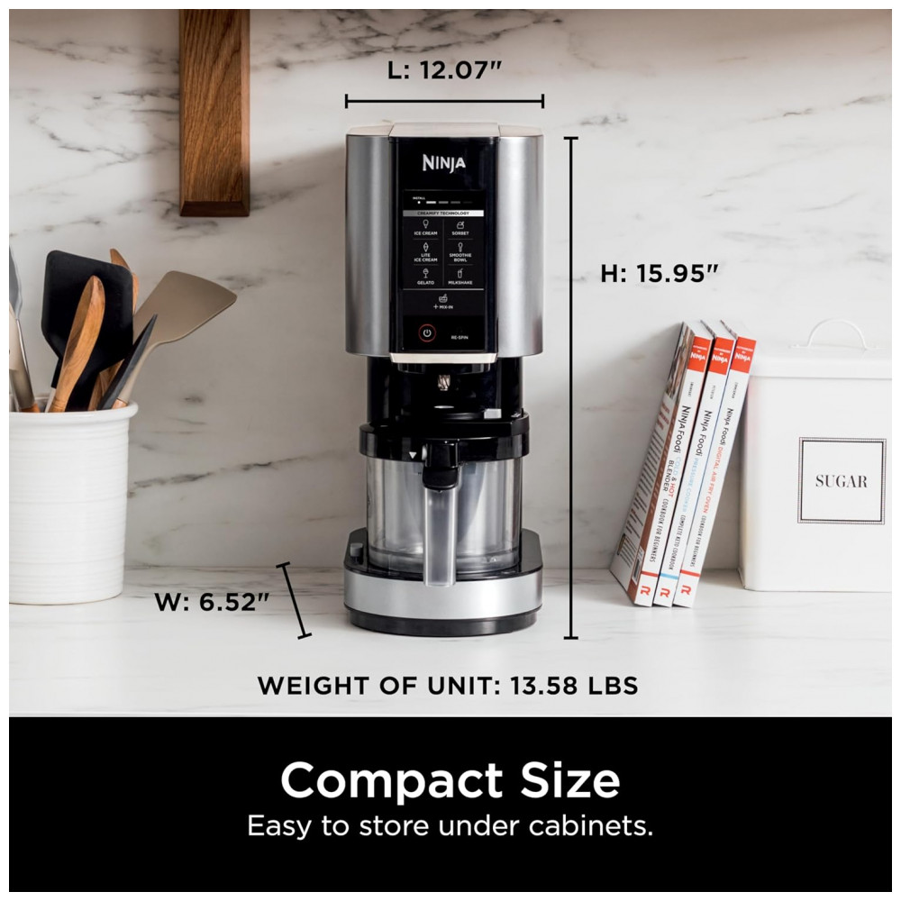 O aparelho inclui dois potes de 473 ml com tampas para armazenamento, um remo Creamerizer e uma tigela externa com tampa para suporte à preparação. Todas as peças removíveis são compatíveis com lava-louças. A capacidade de cada pote é de 16 onças fluidas (473 ml), o produto mede aproximadamente 30,6 cm x 16,6 cm x 40,5 cm (L x P x A) e pesa cerca de 6,2 kg. Opera em voltagem de 120V e potência de 800W, com desligamento automático para segurança.