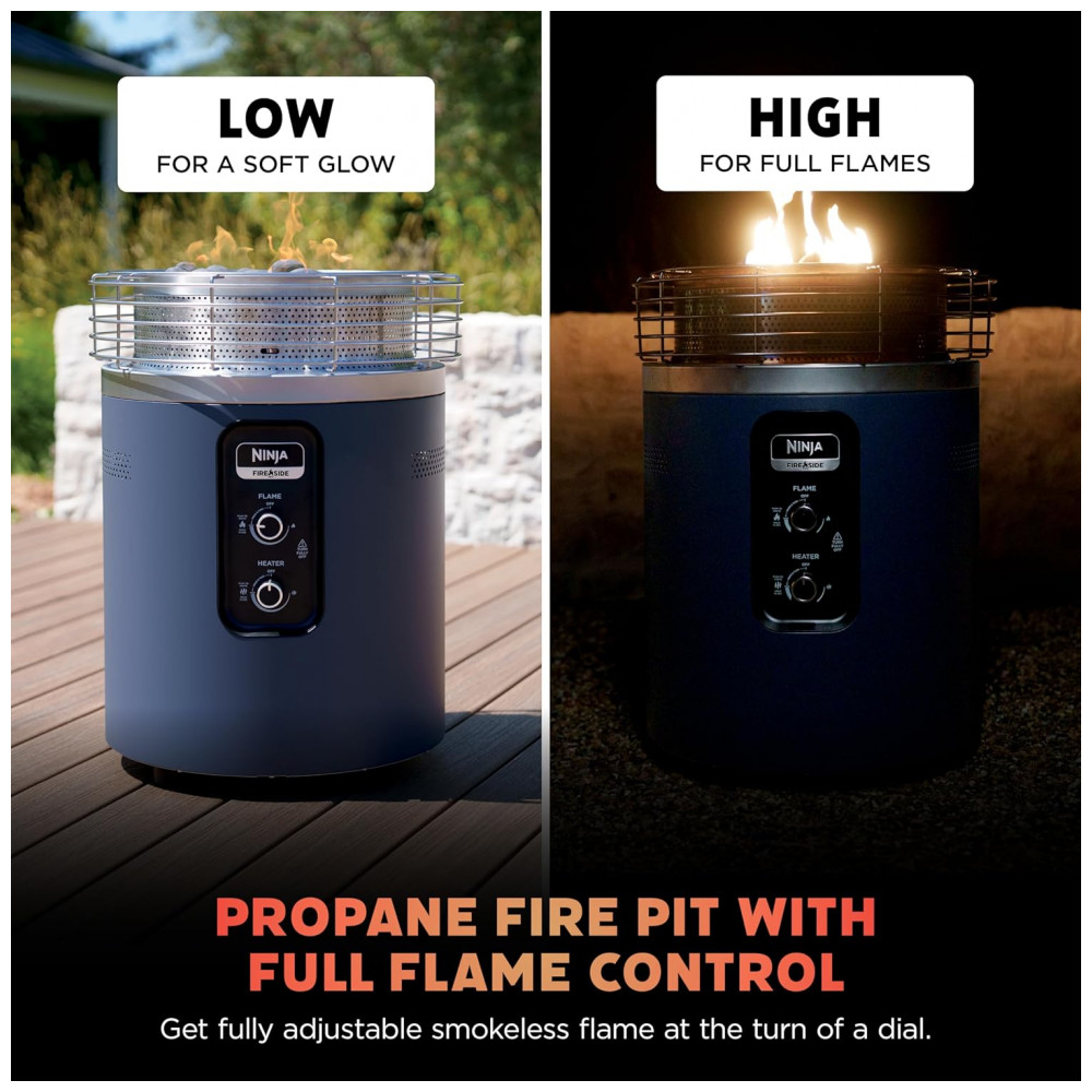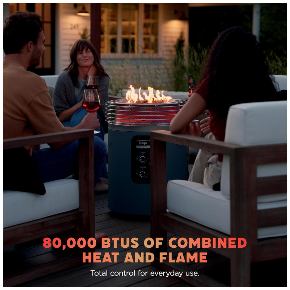 Descubra a praticidade e o conforto de um fire pit a gás propano com a potência de um aquecedor comercial em um único sistema compacto e portátil. O Ninja Fireside360 oferece três modos exclusivos — apenas chama, apenas calor ou chama com calor — permitindo que você escolha a atmosfera perfeita para qualquer ocasião e estação do ano. Ajuste facilmente a altura da chama e a temperatura para personalizar sua experiência e aproveitar o ambiente ideal. Crie um clima acolhedor com o modo chama, ideal para noites amenas, onde o visual do fogo é desejado sem o calor excessivo. Para dias mais frios ou ventosos, o modo aquecimento fornece calor poderoso e constante de até 23.440 kcal/h (80.000 BTUs), garantindo conforto ao ar livre. Combine ambos os modos para obter o máximo de calor e uma atmosfera incrível. Com controle simples por meio de um botão giratório, você pode acender, apagar e ajustar os níveis de chama e calor sem a necessidade de lenha, evitando sujeira, cinzas e fumaça, garantindo uma experiência limpa e agradável. O design resistente às intempéries permite o armazenamento ao ar livre durante todo o ano, e sua construção segura evita faíscas e brasas, tornando-o adequado para uso em grama, pedra ou madeira. Este aquecedor portátil é perfeito para varandas, decks e acampamentos, trazendo conforto e estilo em qualquer ambiente externo.