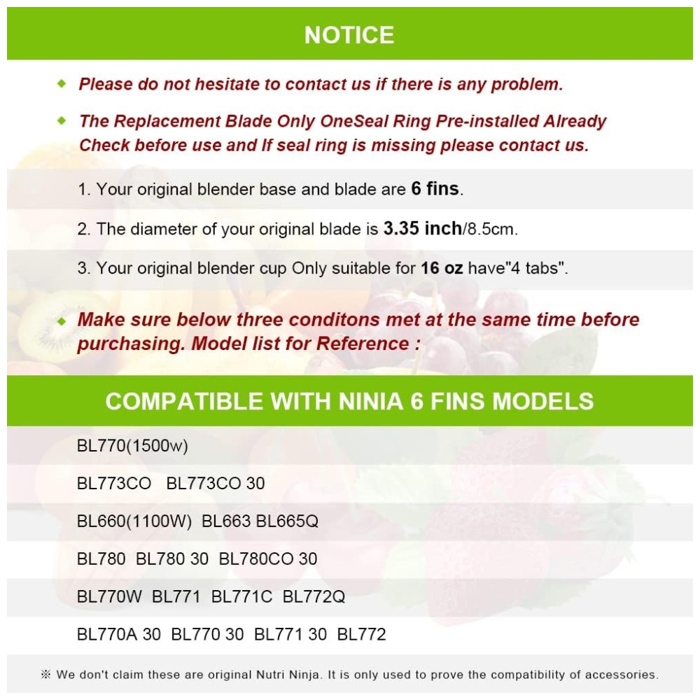 Conjunto de lâmina extratora 6 Fins Ninja Pro Pls Verifique se a lâmina inferior do seu liquidificador Ninja tem 6 aletas. Somente a lâmina do liquidificador de 6 aletas pode ser adequada para esta lâmina. A peça de reposição da lâmina do Blender de 6 aletas é apenas para xícaras individuais de 473ml. NÃO adequado para copos de liquidificador de 532ml, 709ml , 946ml. Diâmetro da lâmina da base 3,34 pol., Altura 1,02 pol., Conforme mostrado na imagem. Compatibilidade Compatível com os seguintes modelos Nutri Ninja Nutri Ninja Extractor Blade Assembly Modelo 307KKU 303KKU 356KKU800 322KKU770 Liquidificador Profissional Ninja com Serviço Único 1100w BL660 Liquidificador Profissional Ninja 1000w BL610 Sistema de Cozinha Ninja Mega 1500w BL770 Liquidificador Profissional Ninja com Único Serviço 1100w BL660 Liquidificador Profissional Ninja 1000w BL610 Sistema de Cozinha Mega Ninja Copos BL740 Misturador Profissional Ninja BL663 Misturador Profissional Ninja BL663CO Misturador Profissional Ninja BL665Q Misturador Profissional Ninja CT610 Misturador Profissional Ninja CT610C Misturador Profissional Ninja NJ600 Sistema Mega Cozinha Ninja BL770W, BL771, BL771C, BL772, BL772Q Sistema de cozinha Ninja Mega com corte , trituração BL773CO, BL773CCO Sistema de cozinha Ninja Supra BL780 Misturador Ninjia de 500 W BL770A 30, BL770 30, BL773CO 30, BL771 30, BL772 30 200w Ninjia Blender BL780 30, BL780C0 30. Existem muitos modelos das lâminas do liquidificador Nutri Ninjia, por favor, verifique com atenção antes de fazer o pedido. Incluído no Pacote 1 x 6 aletas Blender Blender com a junta de borracha já instalada na lâmina