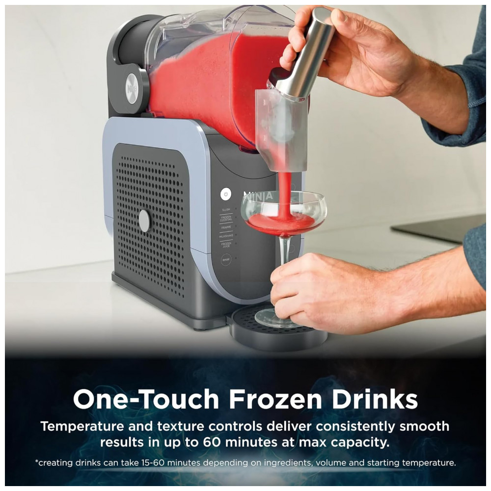 O Ninja Slushi Professional é um fabricador de bebidas congeladas automático com modo de operação simplificado, sem necessidade de gelo ou mistura. Transforma líquidos como vinho, café, refrigerante, suco e leite de chocolate em bebidas congeladas suaves através de seleção de programa intuitiva.