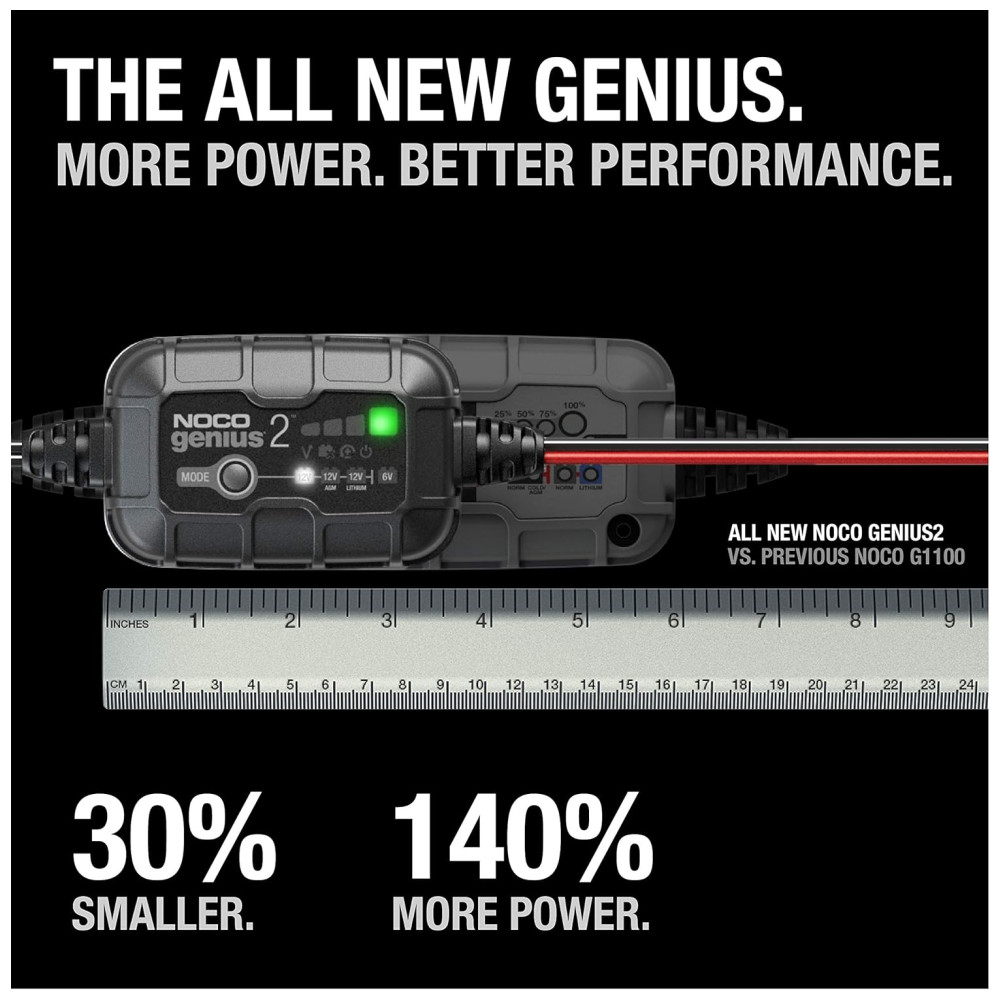 Conheça o GENIUS2 Semelhante ao nosso G1100, mas ainda melhor. É 30 menor e fornece 140 mais potência. É a solução completa carregador de bateria, mantenedor de bateria, carregador lento e dessulfatador de bateria.