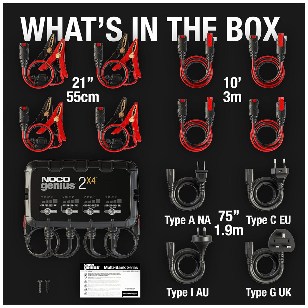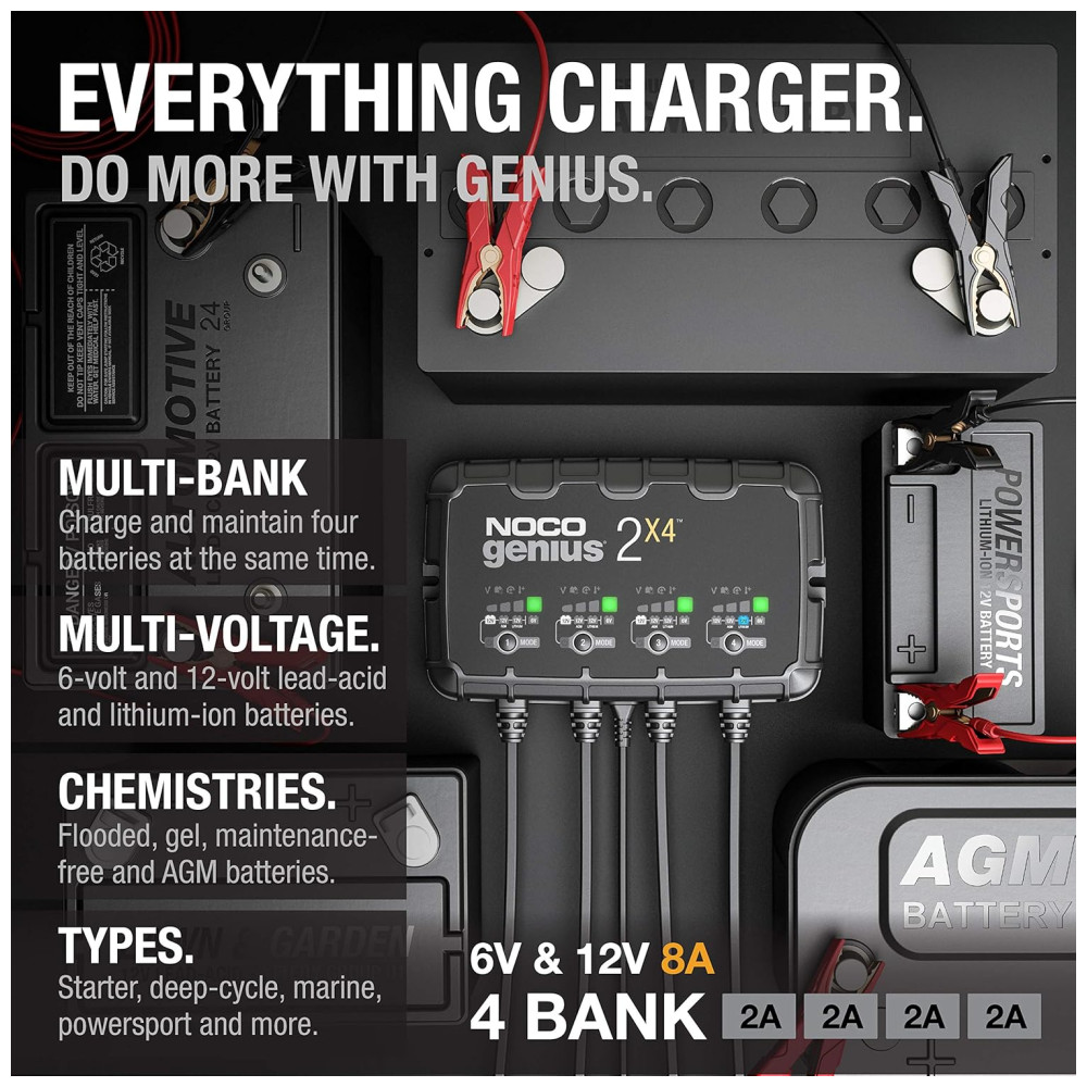 Bancos múltiplos um carregador de bateria de quatro bancos avaliado em eres eres por banco projetado para carregar e manter vários veículos, como carros, motocicletas, barcos, ATVs, RVs, cortadores de grama, tratores de grama, caminhões e muito mais.