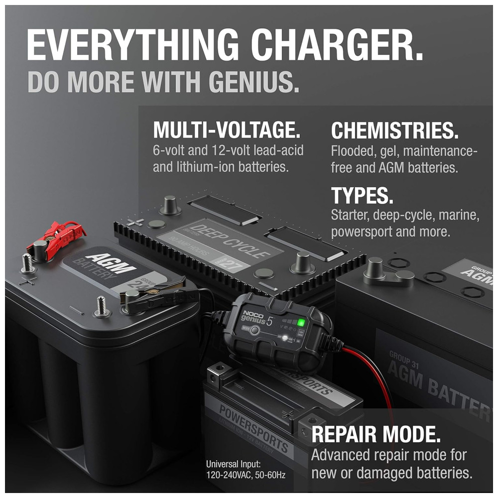 Faça mais com o Genius Projetado para baterias de chumbo ácido automotivas, marítimas e de ciclo profundo de 6 volts e 12 volts, incluindo baterias inundadas, gel, AGM e sem manutenção, além de baterias de íon de lítio.