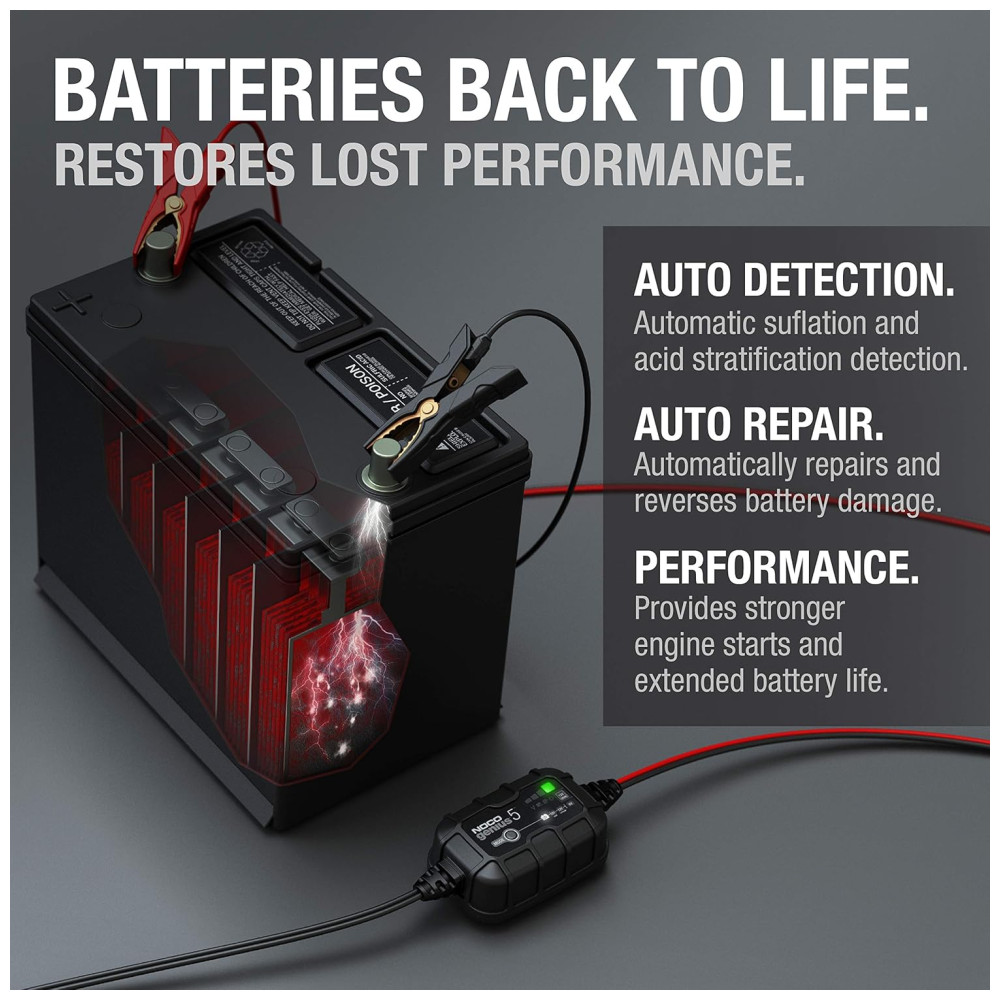 Restaure sua bateria detecta automaticamente a sulfatação da bateria e a estratificação de ácido para restaurar o desempenho da bateria perdida para partidas mais fortes do motor e vida útil prolongada da bateria.