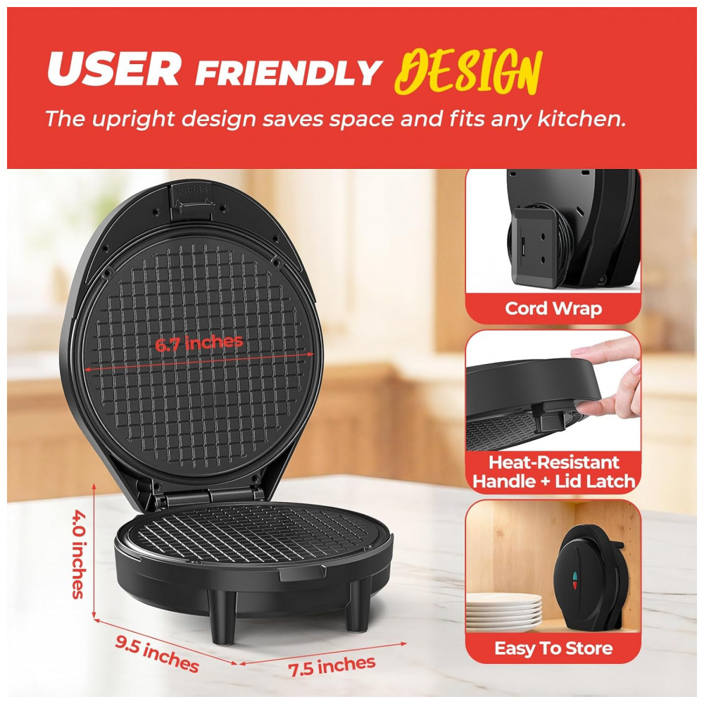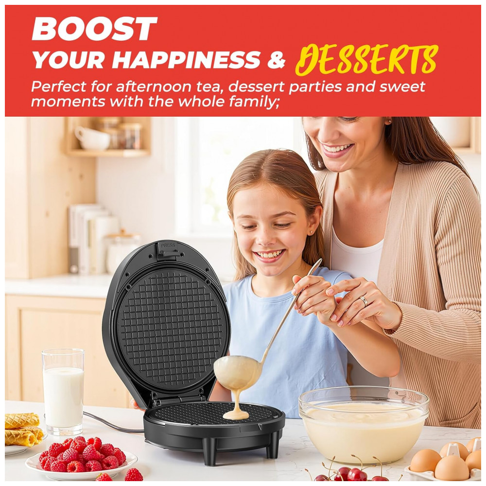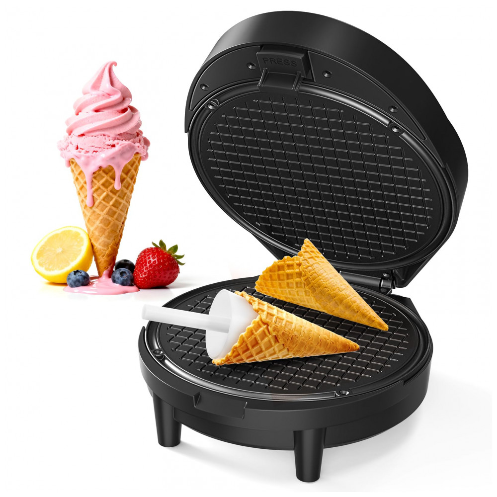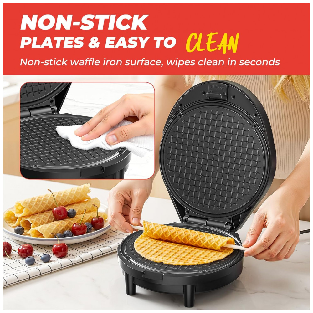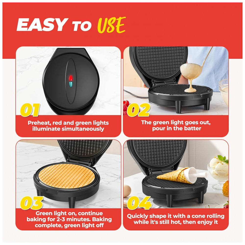 O modelo permite preparar cones crocantes, rolinhos de ovo, waffles egres e stroopwafels holandeses em 2-3 minutos. A estrutura em plástico acomoda uso doméstico frequente em cozinhas residenciais.