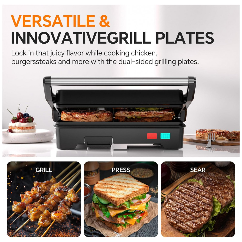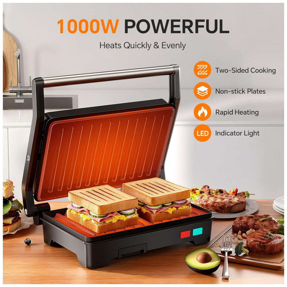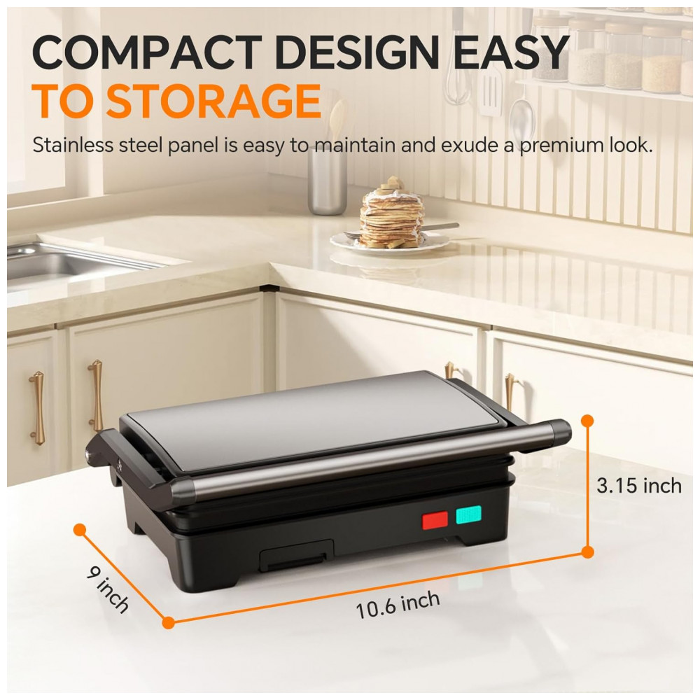 O Novalife Panini Press Grill de 1000W e 120V funciona como prensa sanduíches, grelhador individual ou duplo ao abrir 90°/180°, com placas de 22,4 x 14 cm que acomodam 2 sanduíches grossos ou 1 longo. Controle inteligente de temperatura e indicadores luminosos (vermelho ligado, verde pronto após 2-3 min) garantem cozimento uniforme. Compacto para cozinhas pequenas ou escritórios, mede 21,1 x 21,1 x 7,6 cm e pesa 3 kg, com bandeja gotejadora removível.