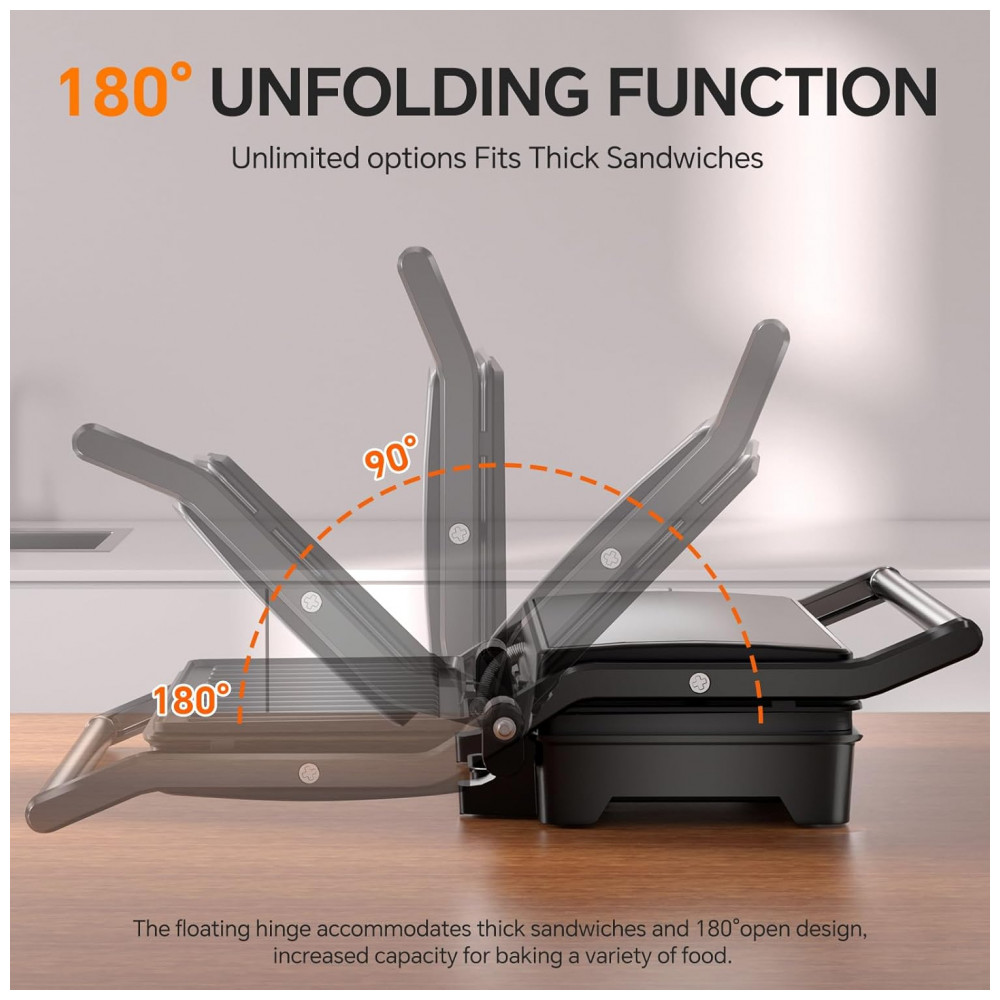 Abertura flutuante ajusta espessura de sanduíches, hambúrgueres, frango ou vegetais. Aquecimento para em temperatura pré-definida. Bandeja removível coleta excessos.