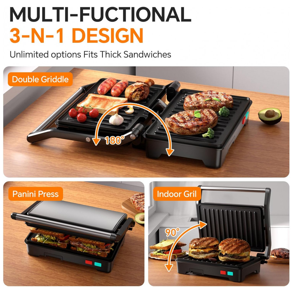 Novalife Sanduicheira Panini Grelhador 3-em-1 Preto 1000W Placas Antiaderentes 180° Abertura