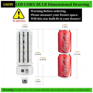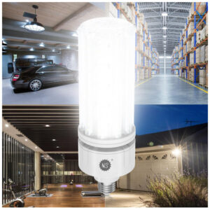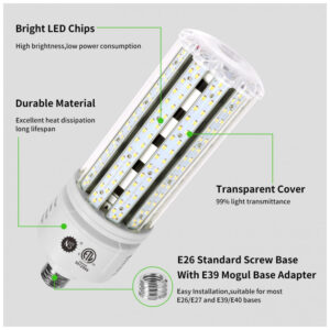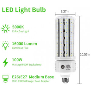 Lâmpada LED COB Corn NS 100W, 5000K, com 16000 lúmens, voltagem AC 110-277V, base E26/E39. Substitui lâmpadas tradicionais como Metal Halide, HID e CFL, ideal para iluminação comercial e industrial. Projetada para alta eficiência energética com iluminação branca neutra (5000K) que proporciona luz uniforme e intensa. Perfeita para uso em galpões, oficinas, estacionamentos e instalações de alta altura (high bay). Essa lâmpada tem driver embutido, dispersão total da luz em 360 graus e design resistente que não requer sistema de ventilação por ventoinha, garantindo baixo aquecimento e maior durabilidade. Compatível com bases E26 e E39, atende tensões amplas de 110 a 277V, tornando-a versátil para vários ambientes industriais e comerciais. Ideal para substituir lâmpadas de 250W a 400W com economia significativa de energia e manutenção reduzida.