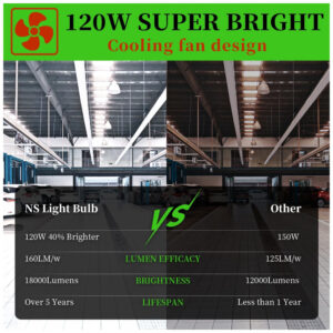 A Lâmpada de Milho LED de 120W da NS oferece alta reprodução de cores CRI80, com impressionantes 18000LM e ângulo de feixe de 360 graus para fornecer uma luz vívida e natural, sem cintilação, iluminando o ambiente com cores mais verdadeiras e belas. Economia de energia e sustentabilidade, a lâmpada de milho de 120W consome até 5000K de potência super alta, com base E26E39 substitui lâmpadas de metal halide HID CFL HPS, sendo uma excelente opção para redução de custos. Para sua segurança, todas as lâmpadas de LED são ecológicas, livres de chumbo e mercúrio, sem radiação ultravioleta ou infravermelha. Certificação ETL assegurada, com dissipação de calor em alumínio e sistema ativo de ventilação para acelerar o resfriamento. Aplicação versátil, ideal para uso em áreas internas e externas de grande porte, como casas, jardins, armazéns, garagens, estacionamentos, porões, praças, fábricas, academias. Fácil de instalar, sem necessidade de ferramentas ou cabeamento, a base E39 é comum para instalação rápida.