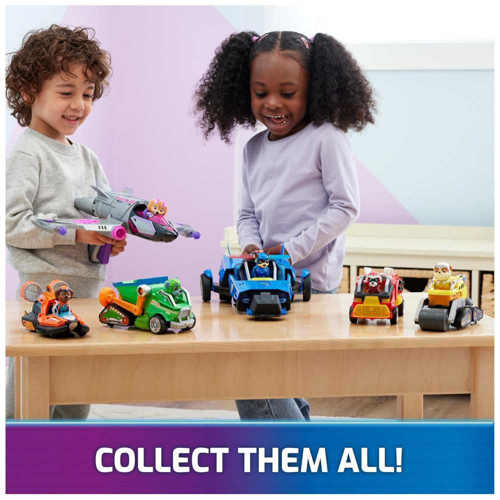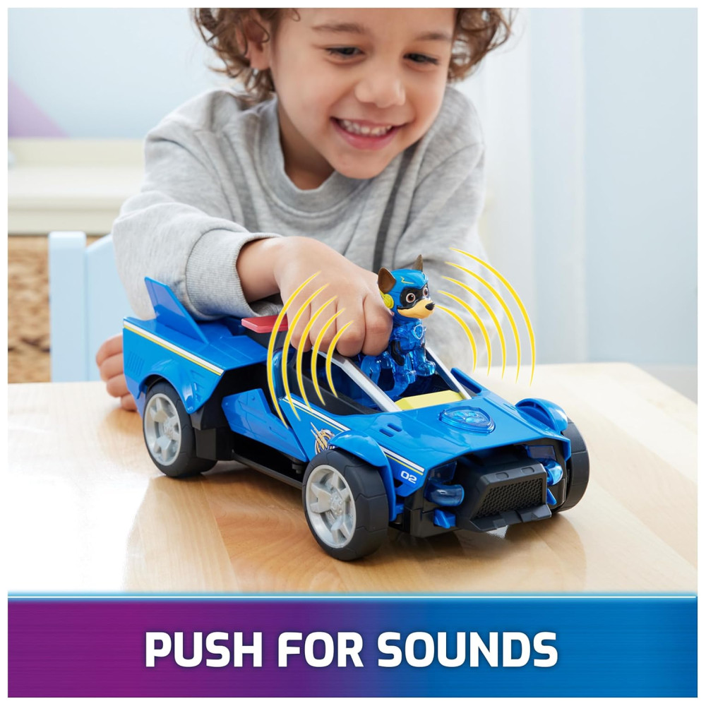 Junte se a Chase e seu veículo de resgate PAW Patrol The Mighty Movie para emocionantes aventuras de resgate direto da tela grande Este carro de brinquedo Patrulha Canina mede mais de 30 cm de comprimento, 15 cm de largura e 10 cm de altura, com um design super elegante, uma incrível transformação de veículo e efeitos sonoros e música emocionantes, com luzes piscantes sincronizadas, que você vê e ouve no filme.