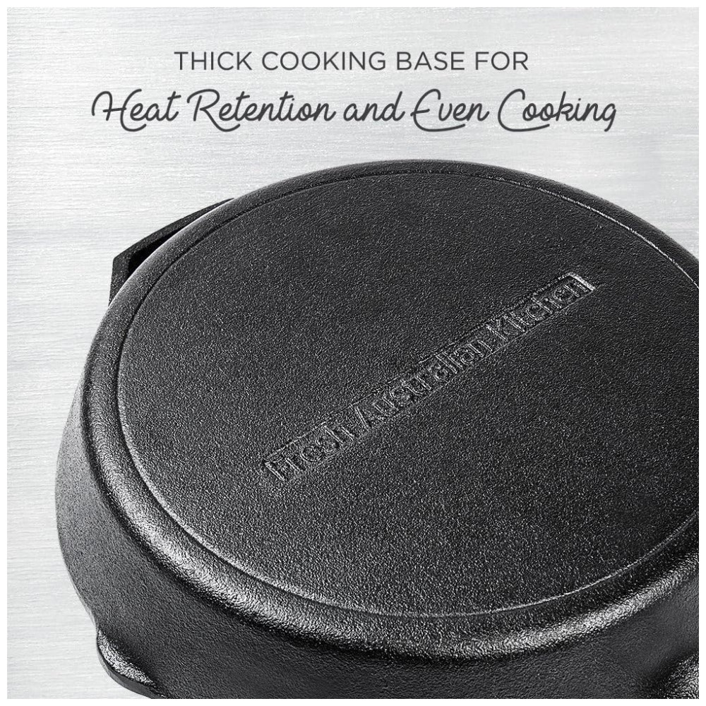 GRILL E CHURRASCO TODO O ANO Mesmo quando está frio ou chovendo lá fora, grelhe sua comida nas saliências da assadeira com nervuras da Fresh Australian Kitchen para obter aquele sabor e aparência ao ar livre. O ferro fundido na nossa grelha A frigideira tem retenção de calor imbatível, o que significa que o calor é disperso por toda a superfície de sua base espessa para um cozimento completo e uniforme.