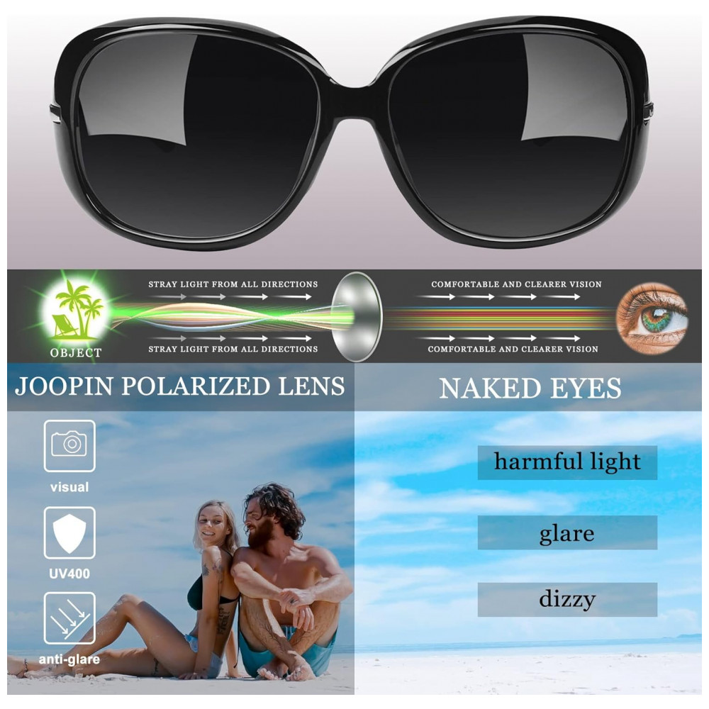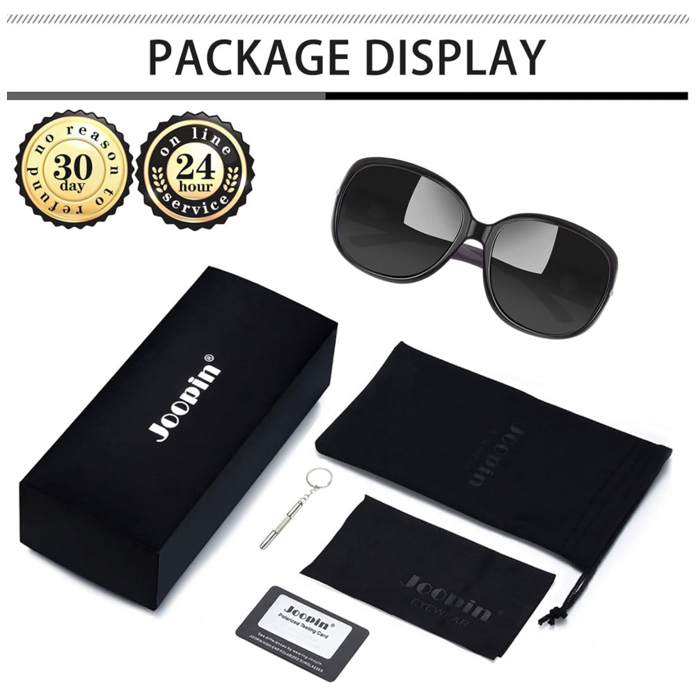O PACOTE INCLUI Óculos de sol divertidos Joopin para mulheres x1, caixa macia x1, bolsa requintada x1, pano de lente x1, cartão de teste polarizado x1. Entre com estilo e tenha uma experiência única com os óculos de sol simples Joopin