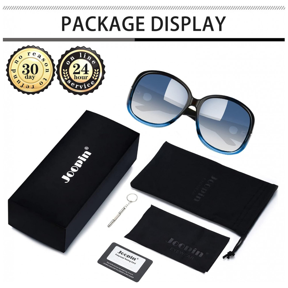 O PACOTE INCLUI Óculos de sol grandes azuis Joopin para mulheres x1, caixa macia x1, bolsa requintada x1, pano de lente x1, cartão de teste polarizado x1. Entre com estilo e tenha uma experiência única com os óculos de sol da moda Joopin