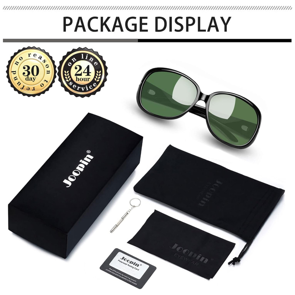 EXCELENTE LENTE POLARIZADA Estes óculos de proteção solar com lentes grandes polarizadas e não reflexivas dão aos seus belos olhos uma ótima proteção solar. Os óculos Joopin de tons polarizados superiores reduzem o brilho, restauram a cor verdadeira, proporcionam uma visão mais clara, aliviam a fadiga ocular. Estes óculos de sol femininos polarizados reais são a melhor escolha para dirigir, fazer compras, tomar banho de sol, pescar, correr, andar de bicicleta, escalar, férias, praia, qualquer atividade ao ar livre.