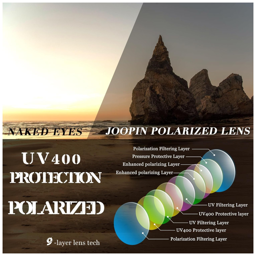 LENTE POLARIZADA HD Os óculos de sol polarizados femininos antirreflexo Joopin reduzem o brilho refletido em estradas, corpos dágua, neve e outras superfícies horizontais. Os óculos de sol Joopin polarizados podem restaurar a cor verdadeira, sem distorção ou deformação de imagens saturadas de cores. E se você sentir dores de cabeça devido à sensibilidade à luz, as lentes polarizadas dos óculos de sol preto Joopin podem ajudá lo a sentir dores de cabeça menos intensas. Joopin sempre protege seus olhos perfeitamente.