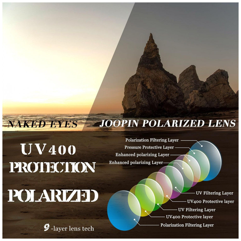 LENTE POLARIZADA HD Os óculos de sol polarizados Joopin reduzem o brilho refletido nas estradas, corpos dágua, neve e outras superfícies horizontais. Restaure a cor verdadeira, elimine a luz refletida e a luz dispersa e proteja os olhos perfeitamente.