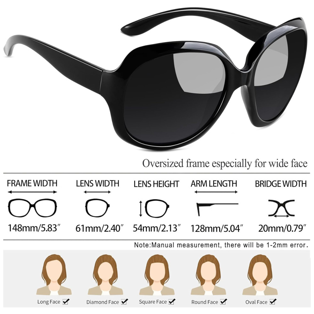 EXCELENTE PROTEÇÃO UV400 As lentes de visão dos óculos de sol grandes são classificadas como 400UV, podem bloquear 99 100 da radiação UVA e UVB. Os óculos de sol femininos polarizados com lentes resistentes a arranhões são essenciais para proteger seus olhos contra danos UV de longo prazo e manter seus olhos saudáveis. Quer esteja nublado ou ensolarado, os óculos de sol uv são as formas eficazes de prevenir o envelhecimento da pele ao redor dos olhos. Os óculos de sol largos são confortáveis de usar, garantindo 100 de proteção UV.