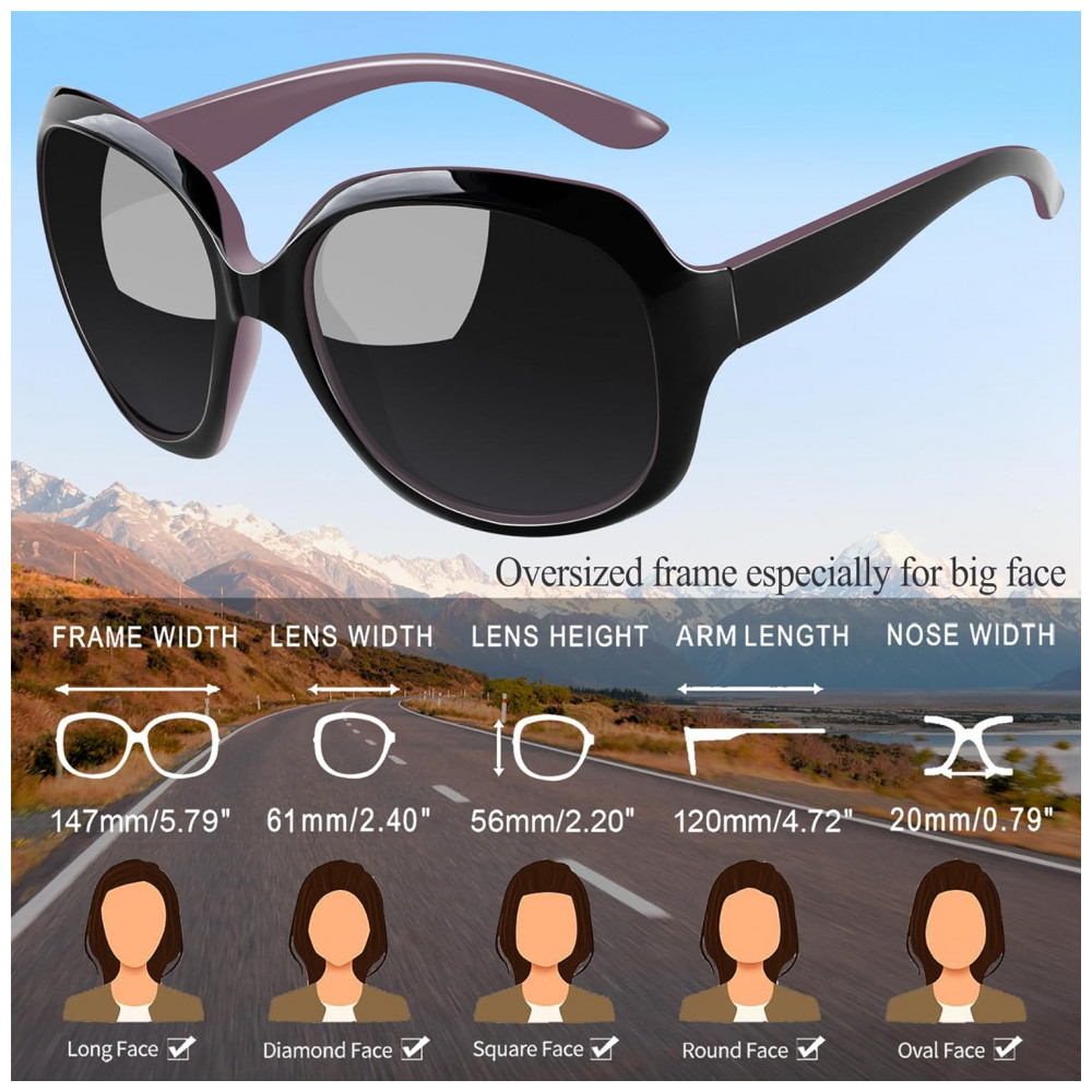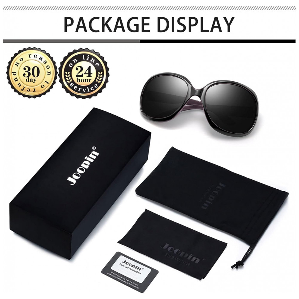 LENTE POLARIZADA SUPERIOR Os óculos de sol polarizados antirreflexo Joopin para mulheres reduzem o brilho refletido em estradas, corpos dágua, neve e outras superfícies horizontais. Os óculos polarizados podem restaurar a cor verdadeira, sem distorção de imagens saturadas de cores. Lentes polarizadas de óculos de sol grandes podem ajudá lo a aproveitar o sol sem problemas. Os óculos escuros Joopin sempre protegem seus olhos perfeitamente. Os grandes óculos roxos pretos Joopin levam você para curtir a natureza.
