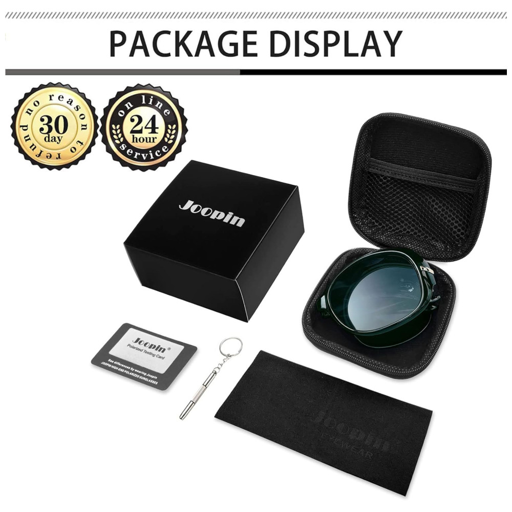 O QUE VOCÊ RECEBERÁ elegantes óculos de sol dobráveis x 1 , caixa macia x 1 , estojo rígido portátil x 1 , pano de lente x 1 , chave de fenda prática x 1 , cartão de teste polarizado x1. Joopin se concentra em óculos de sol da moda, cada produto perfeito trará a você uma experiência confortável. Clique e adquira já seus óculos de sol baratos e de alta qualidade