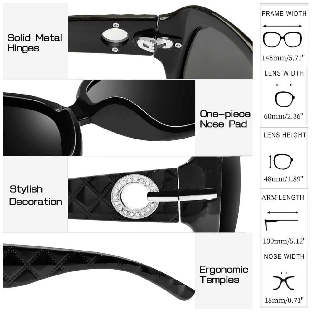POR QUE VOCÊ MERECE Estes óculos pretos escuros femininos com lentes polarizadas, escuras e não reflexivas dão aos seus lindos olhos a ótima proteção solar. Óculos de sol legais podem reduzir o brilho refletido nas estradas, água, neve e outras superfícies horizontais, restaurar a cor verdadeira, fornecer visão clara, aliviar a fadiga ocular. A simples mulher de óculos de sol verde não tem sensação de opressão em seu rosto e orelha, com lindos óculos de strass brilhantes para mulheres, combina com qualquer coisa que você colocar, você adora.
