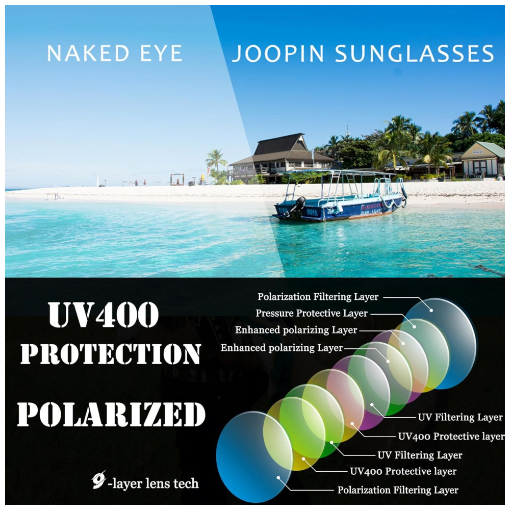 EXCELENTE LENTE POLARIZADA Estes óculos de proteção solar com lentes grandes polarizadas e não reflexivas dão aos seus belos olhos uma ótima proteção solar. Os óculos Joopin de tons polarizados superiores reduzem o brilho, restauram a cor verdadeira, proporcionam uma visão mais clara, aliviam a fadiga ocular. Estes óculos de sol femininos polarizados reais são a melhor escolha para dirigir, fazer compras, tomar banho de sol, pescar, correr, andar de bicicleta, escalar, férias, praia, qualquer atividade ao ar livre e em ambientes fechados para olhos sensíveis.