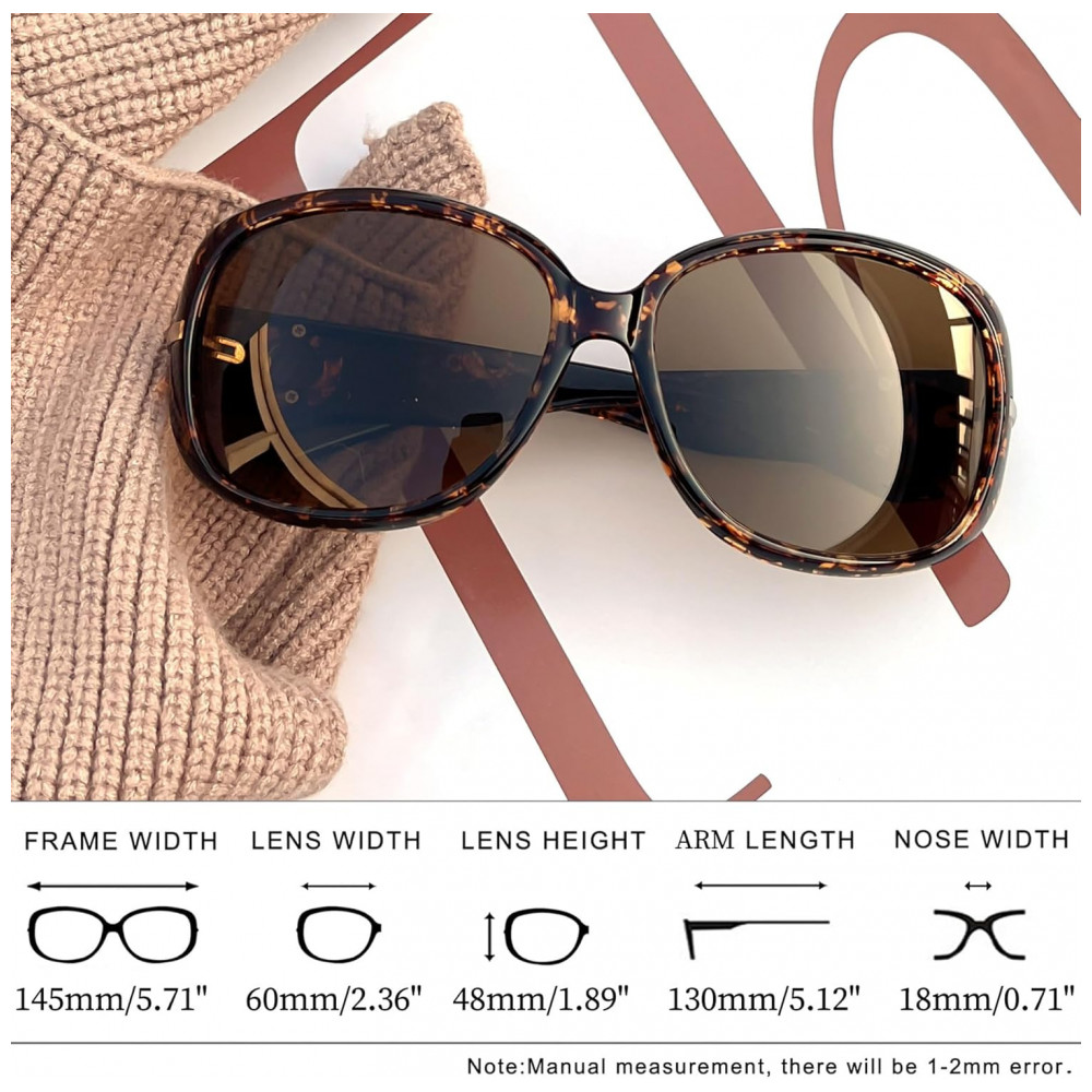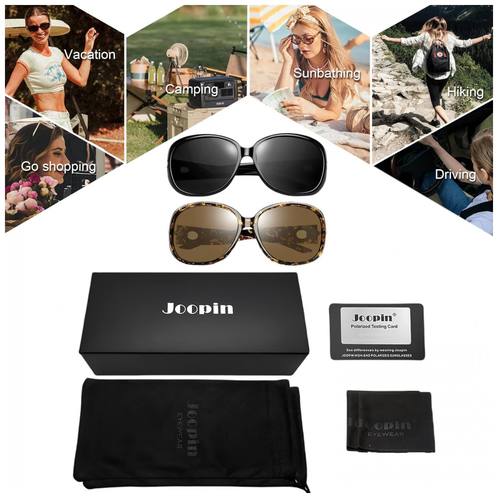 O PACOTE INCLUI Grandes óculos de sol pretos para mulheres x 1, óculos de sol de tartaruga para mulheresx 1, bolsa requintada x 2, pano de lente x 2, cartão de teste polarizado x 1
