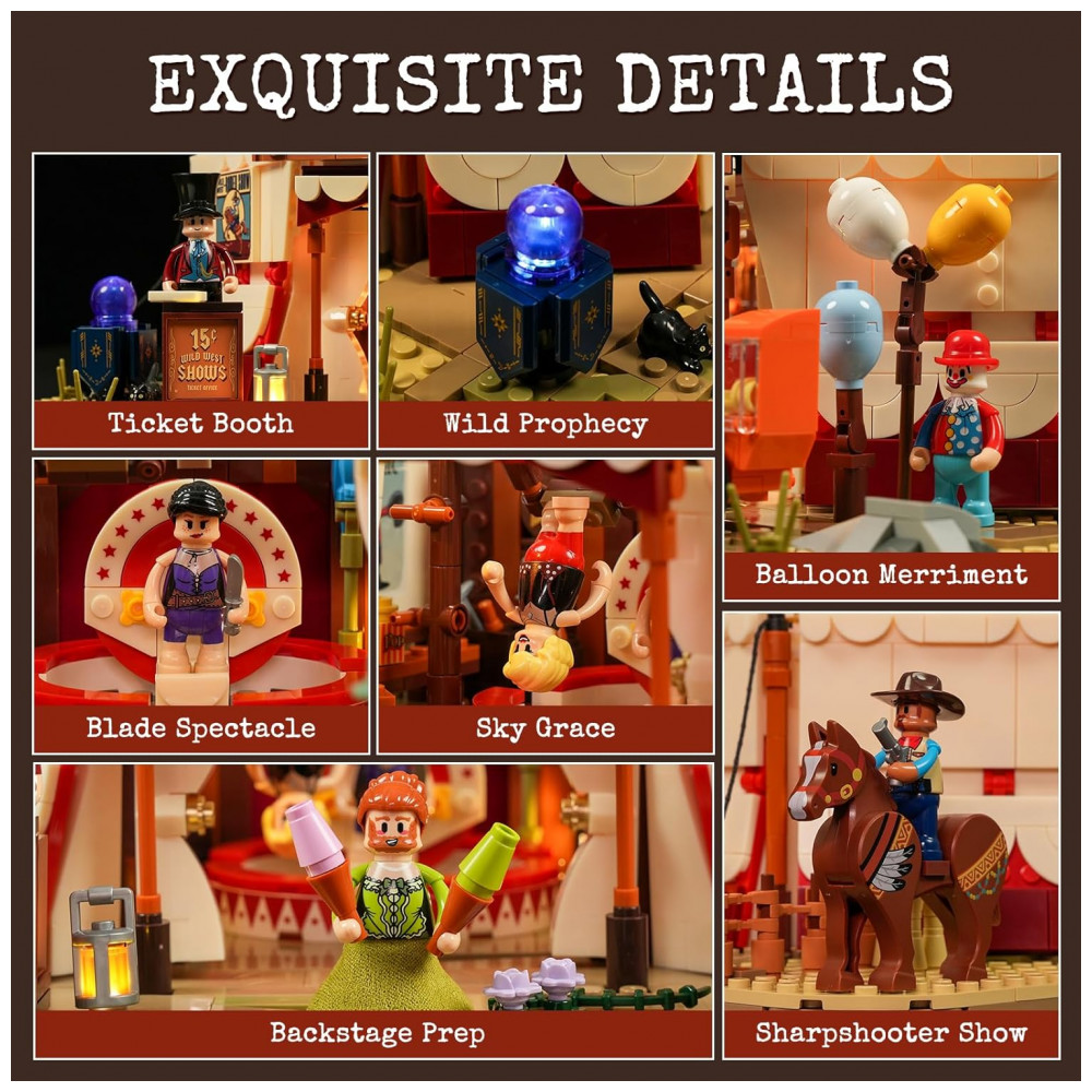 Em ambos os modelos o foco é a ambientação: o blacksmith enfatiza texturas de madeira desgastada, pedra rachada e metal remendado, com detalhes narrativos como barra de ouro escondida, retrato de família e roupas alternativas do ferreiro. O circo acrescenta seis artistas diferentes, barracas de jogos, comida, leitura de fortuna e pequenos “segredos” de personagens, criando um centro de festa que se integra naturalmente ao cenário de cidade western da linha Lumibricks Old West.