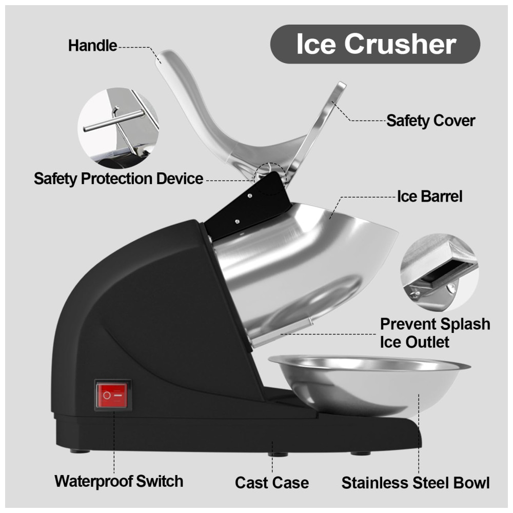 Alta eficiência e três lâminas Nossas três lâminas afiadas e um poderoso motor elétrico de partida trazem a você um triturador de gelo altamente eficiente, esmagando até 99 kg de gelo picado por hora