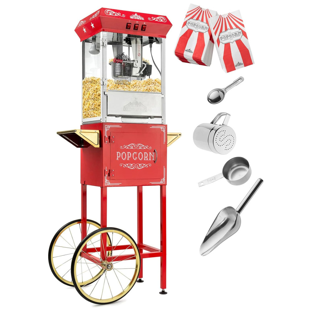 Carrinho conveniente e acessórios de aço inoxidável o carrinho possui rodas grandes de , estilo bicicleta, com rolamento de esferas para uma mobilidade suave e fácil portabilidade. O carrinho também oferece amplo espaço de zenamento, mantendo óleos, temperos, xícaras e outros acessórios de pipoca convenientemente organizados e prontamente acessível para uso. A máquina de pipoca vem com estes acessórios de aço inoxidável copo medidor de 1, 2 xícara, colher de sopa, colher de pipoca e saleiro.