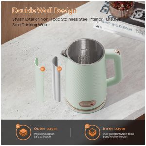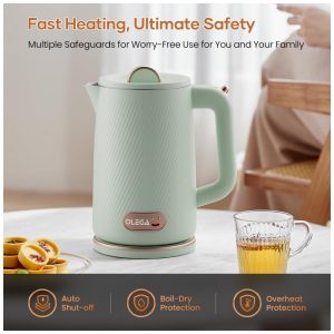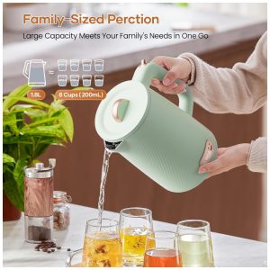 Ferva água rapidamente com a potência de 1500W! Diga adeus às longas esperas com esta chaleira elétrica oleoga, que aquece a água em poucos minutos, ideal para suas manhãs corridas, pausas para chá ou quando precisar de água quente com rapidez. Com capacidade de 1,8 litros, é perfeita para servir de 4 a 6 pessoas, ideal para chá, café, sopas ou mingaus. Seu design seguro conta com uma camada dupla: o exterior em plástico cool-touch protege suas mãos contra queimaduras, enquanto o interior em aço inoxidável 304 de grau alimentício e livre de BPA garante a pureza da água, para uma bebida sempre saudável. A chaleira possui desligamento automático ao atingir o ponto de fervura, além de proteção contra funcionamento a seco, evitando superaquecimento e prolongando a vida útil do produto. Com design moderno e elegante, ela se encaixa perfeitamente em qualquer cozinha. A tampa removível facilita a limpeza, mantendo sua chaleira sempre impecável e pronta para uso. Compacta, segura e eficiente, a chaleira elétrica oleoga é a escolha perfeita para quem valoriza rapidez, segurança e estilo no preparo das suas bebidas favoritas.