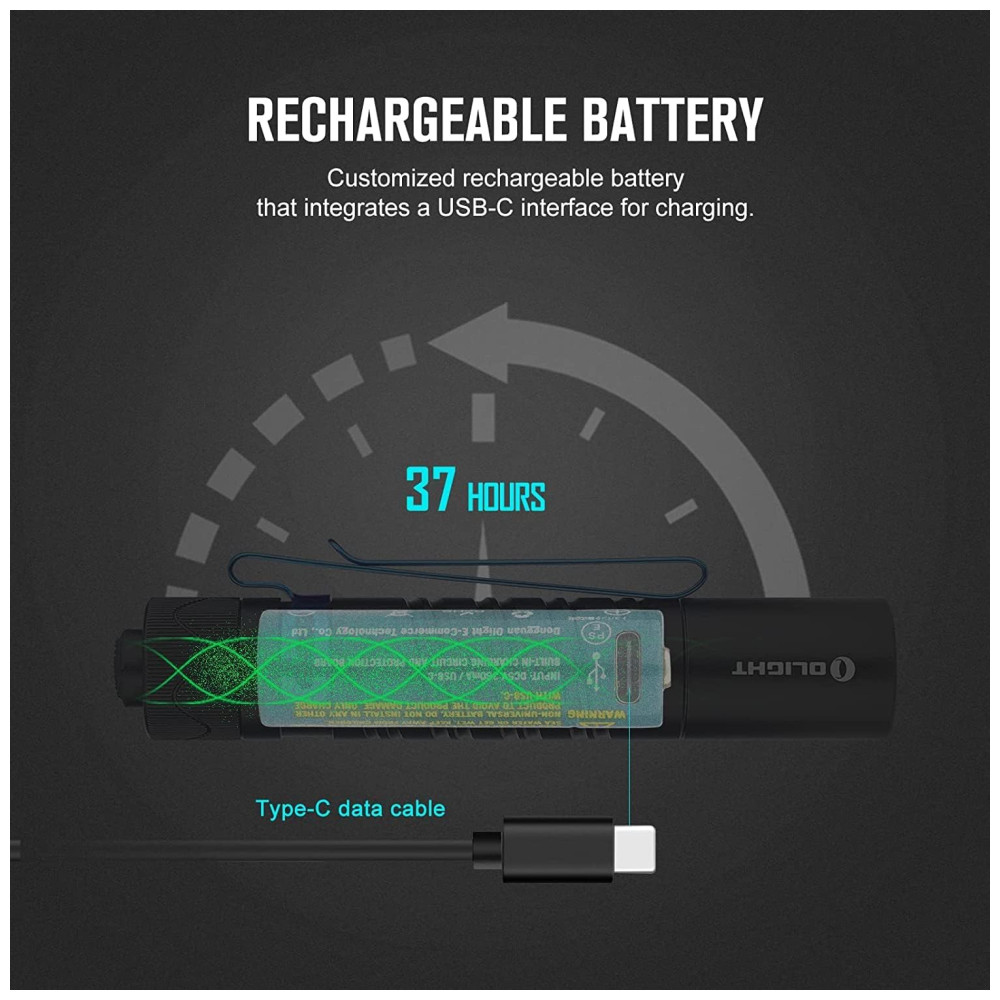 Bateria recarregável Bateria recarregável personalizada que integra uma interface Tipo C para carregamento. Energia suficiente para 37 horas de uso em 15 lumens depois de totalmente carregada.