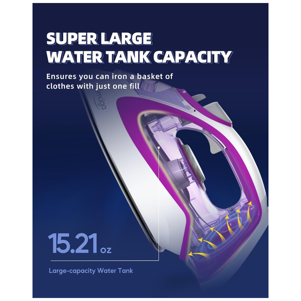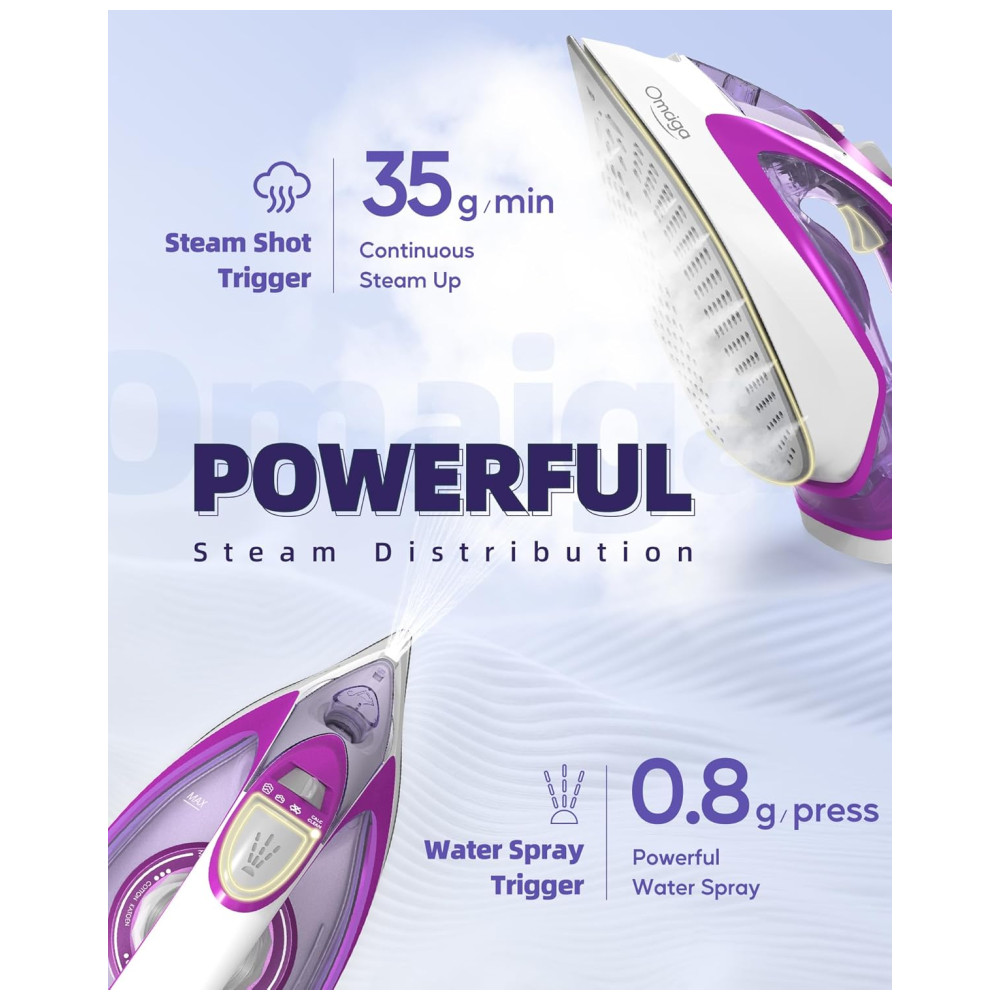 RÁPIDO E EFICIENTE O ferro a vapor OMAIGA aquece rapidamente em 30 segundos e fornece uma saída de vapor potente, e a taxa de vapor de 25g , min pode remover rugas da roupa facilmente e torná la lisa e bem passada, mostrando seu look perfeito em um momento.