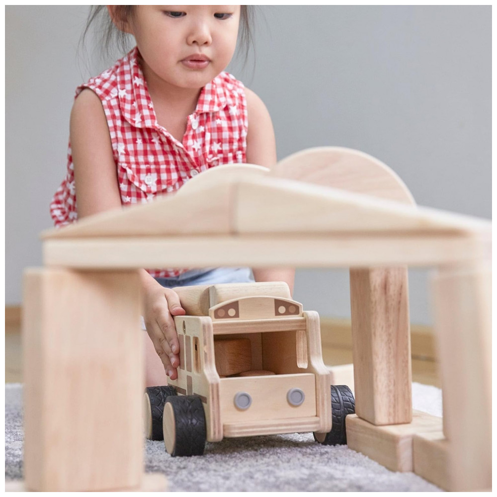 O brinquedo é fornecido totalmente montado, pronto para uso, e possui proporção adequada para crianças a partir de 2 anos, podendo ser integrado a sistemas de blocos de construção e estradas em madeira. A construção em madeira de alta resistência suporta uso frequente em salas de aula, brinquedotecas e ambientes domésticos, oferecendo um recurso durável para contextos de brincadeira dramática.