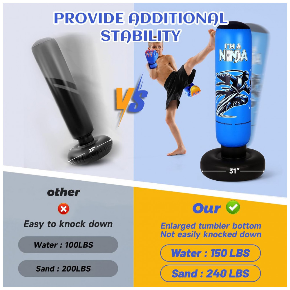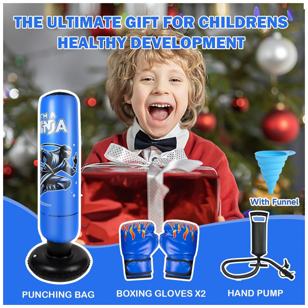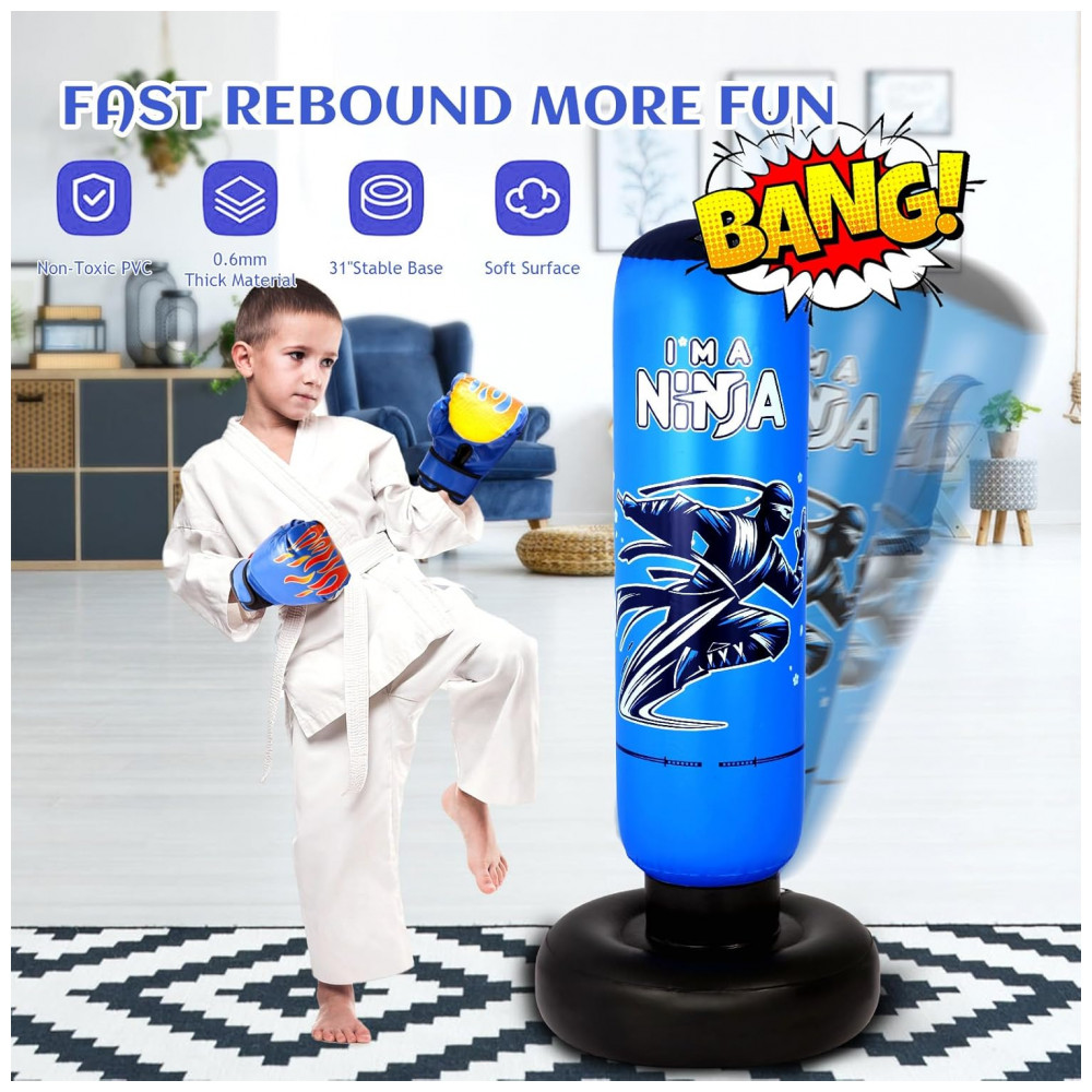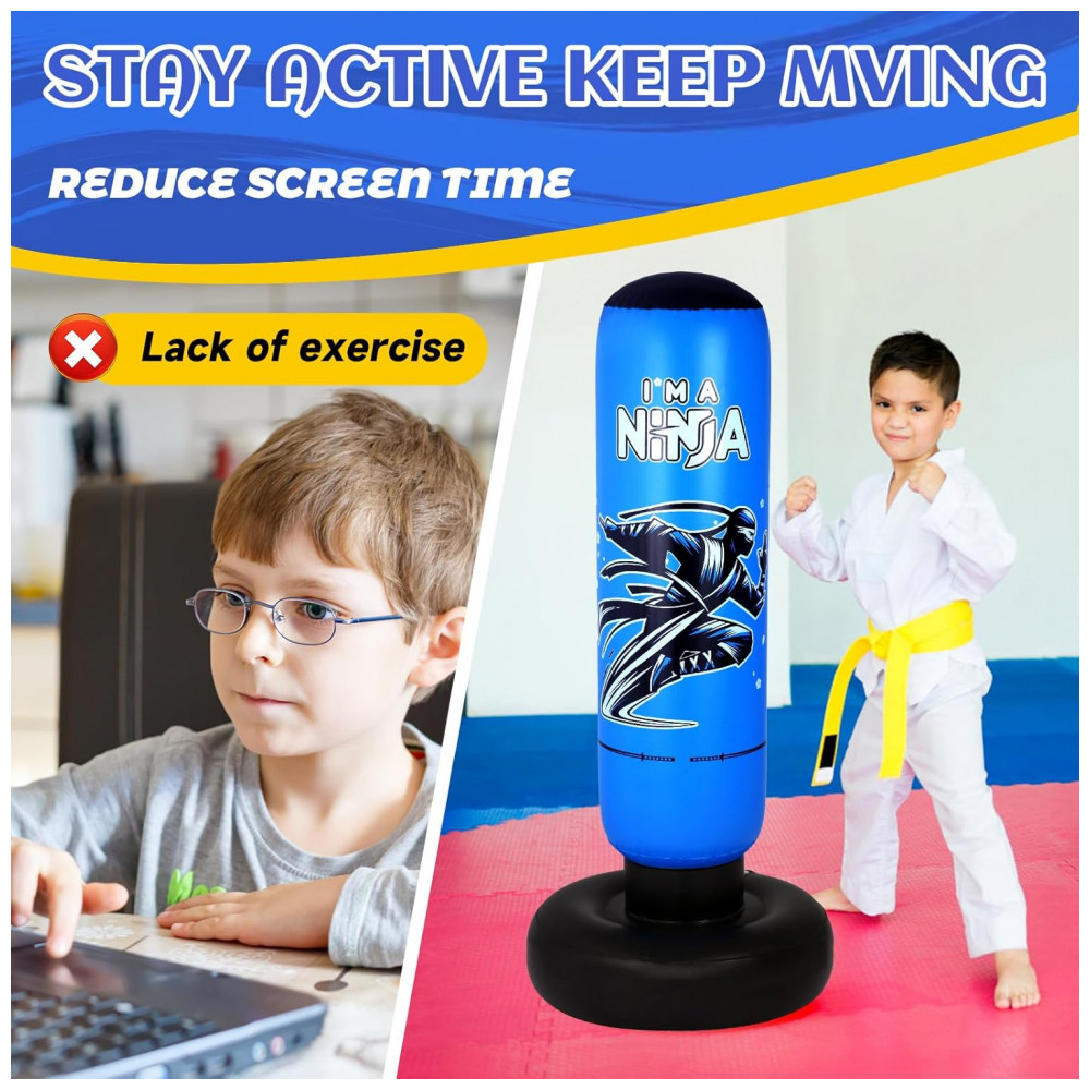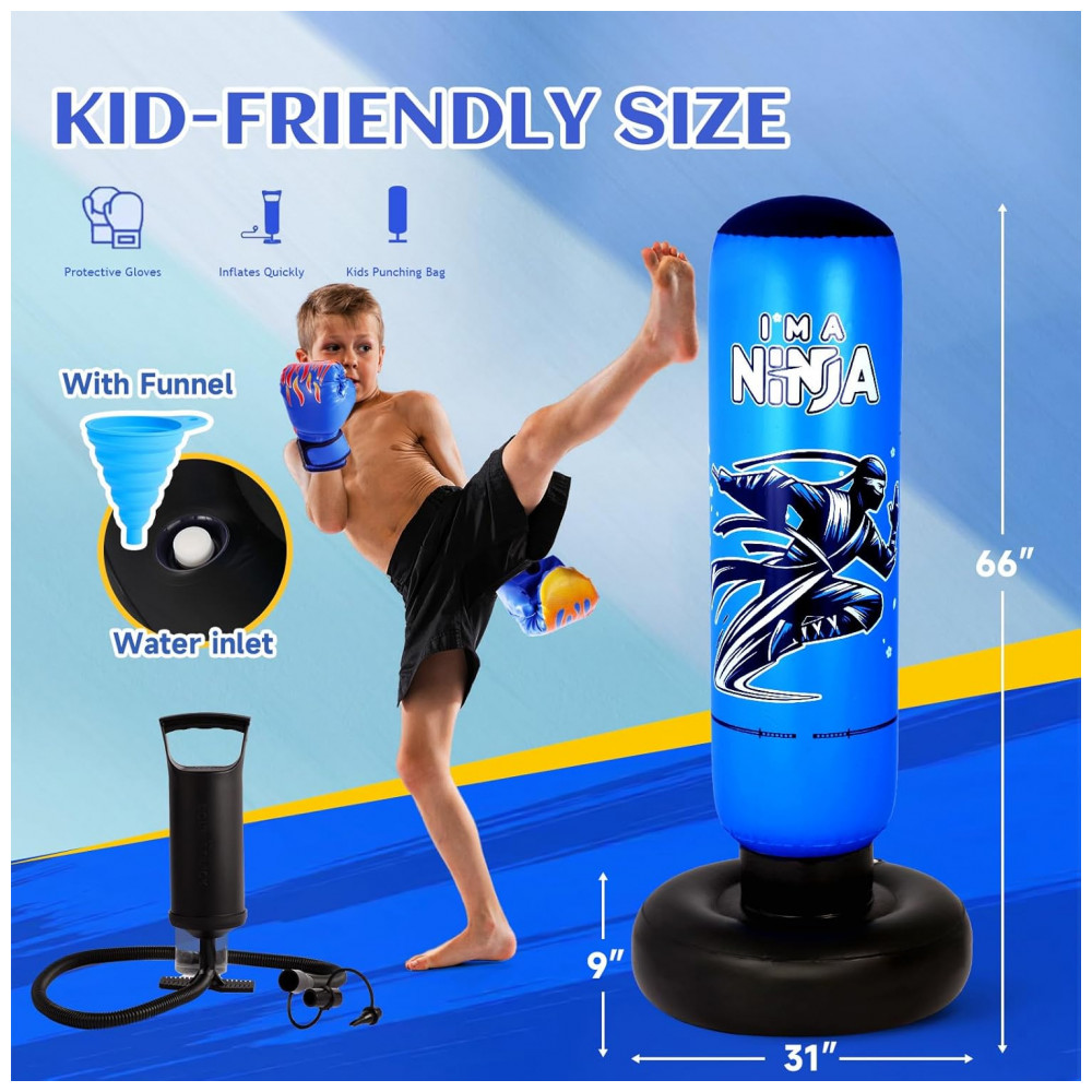 Onirii Kit Boxe Inflável Infantil Ninja Azul 168cm com Luvas e Bomba – Brinquedo Fitness 4 em 1 para Crianças 5-12 Anos