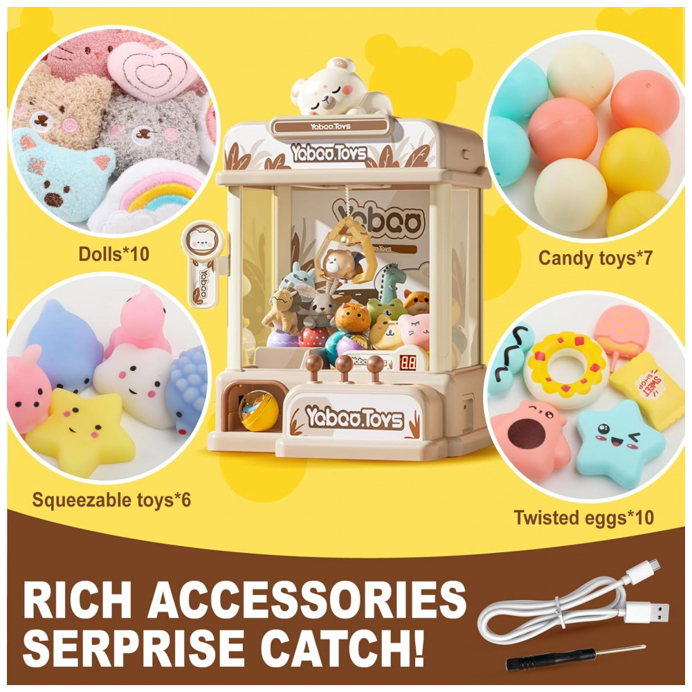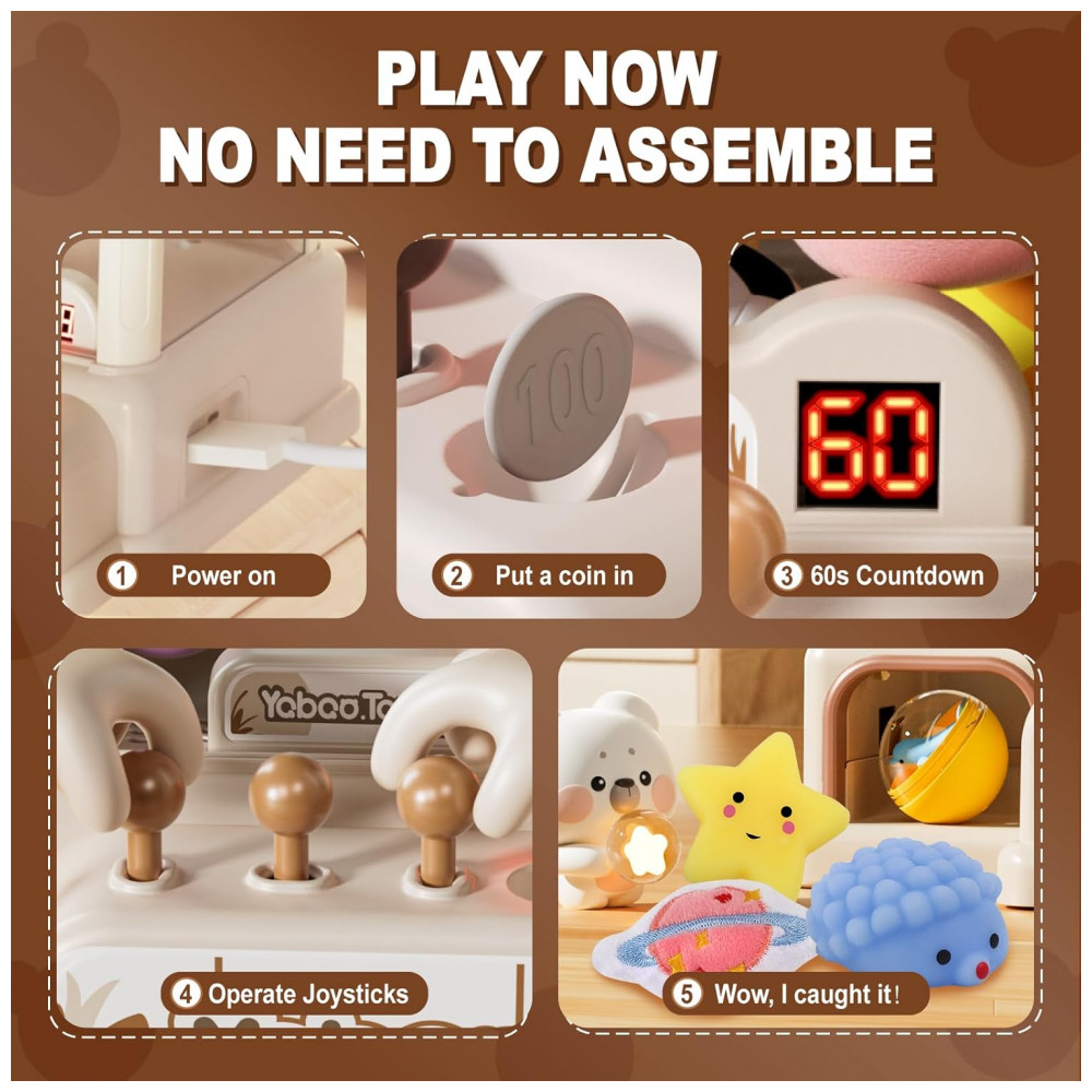 O brinquedo possui modos de energia dupla, podendo ser usado com cabo USB ou 3 pilhas AA (não incluídas), e permite movimentar a garra pelo joystick. Ao agarrar um prêmio, a garra sobe automaticamente e libera o item, permitindo competições amigáveis entre crianças para ver quem consegue pegar mais brinquedos dentro do tempo de jogo. A máquina estimula habilidades de coordenação motora, concentração e percepção visual, tornando-a perfeita tanto para brincadeiras individuais quanto para festas e momentos em família.