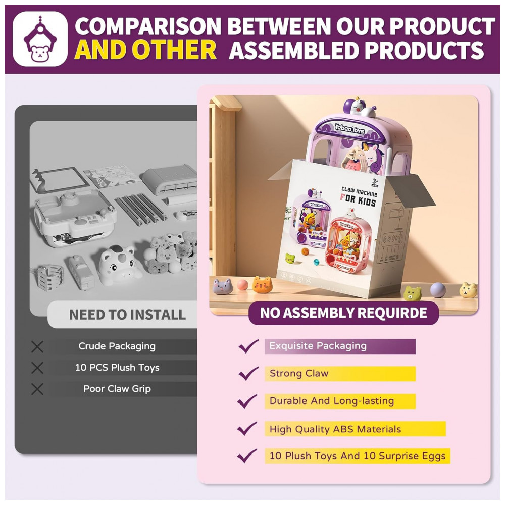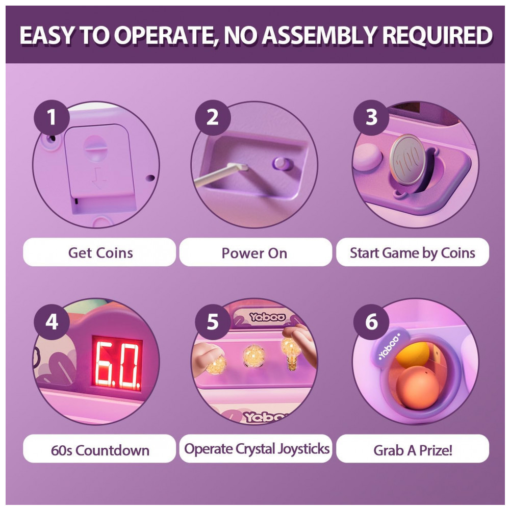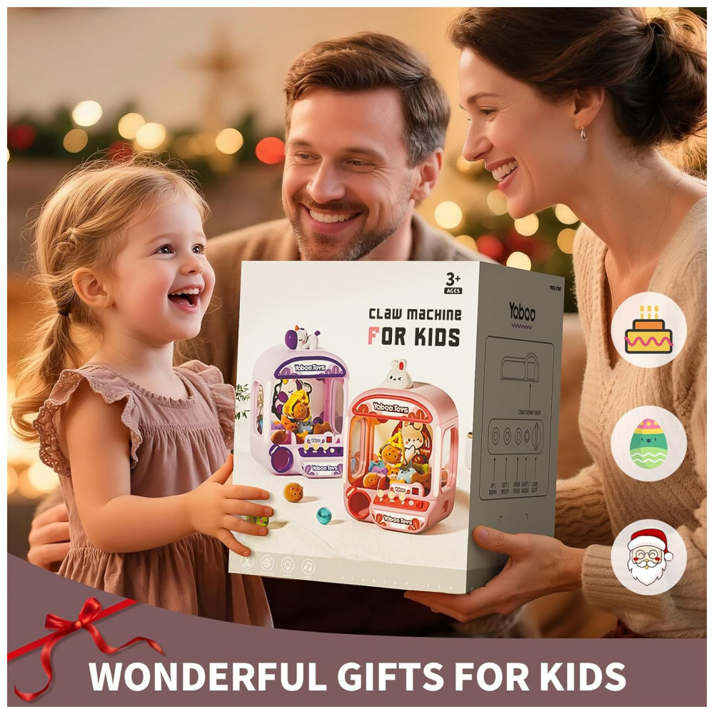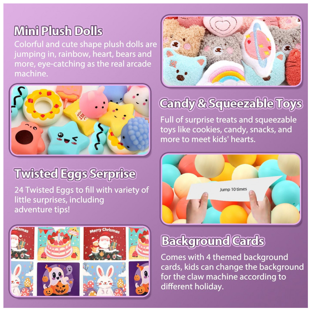 O brinquedo é alimentado por USB ou 4 pilhas AA (não inclusas) e possui garra com 360° de rotação, controlada por três joysticks que facilitam a captura dos prêmios. O design seguro em plástico ABS com bordas lisas garante diversão sem riscos. Ideal para uso doméstico, festas, eventos escolares ou para momentos de interação familiar, a máquina incentiva a coordenação motora, concentração e habilidades sociais, ao mesmo tempo que oferece diversão interativa sem telas.