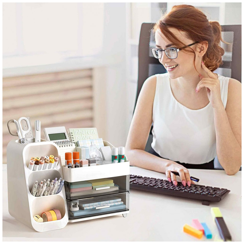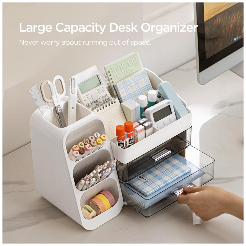 Este organizador de mesa HBlife em plástico ABS branco oferece estrutura única com porta‑canetas dedicado, quatro compartimentos superiores e duas gavetas para armazenamento de itens de papelaria e pequenos acessórios. O design foi desenvolvido para uso sobre superfícies de trabalho em escritórios, residências, escolas e estúdios de arte.