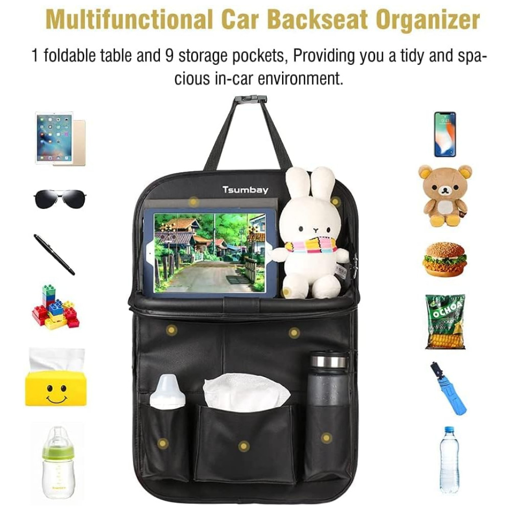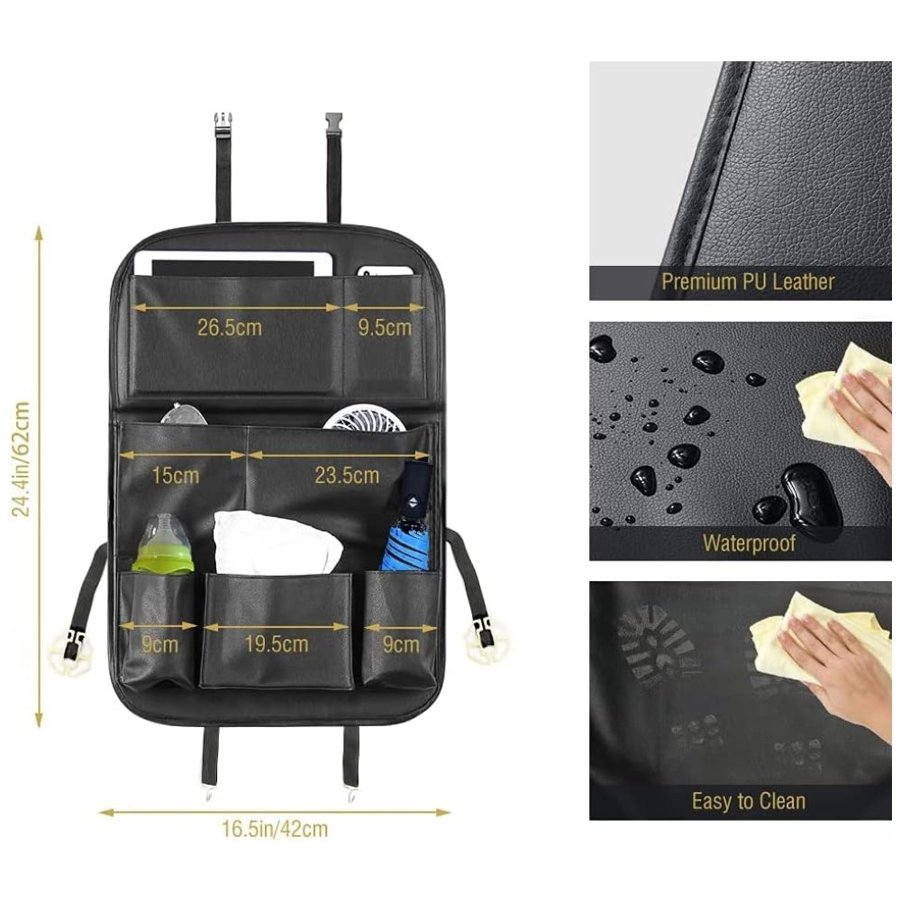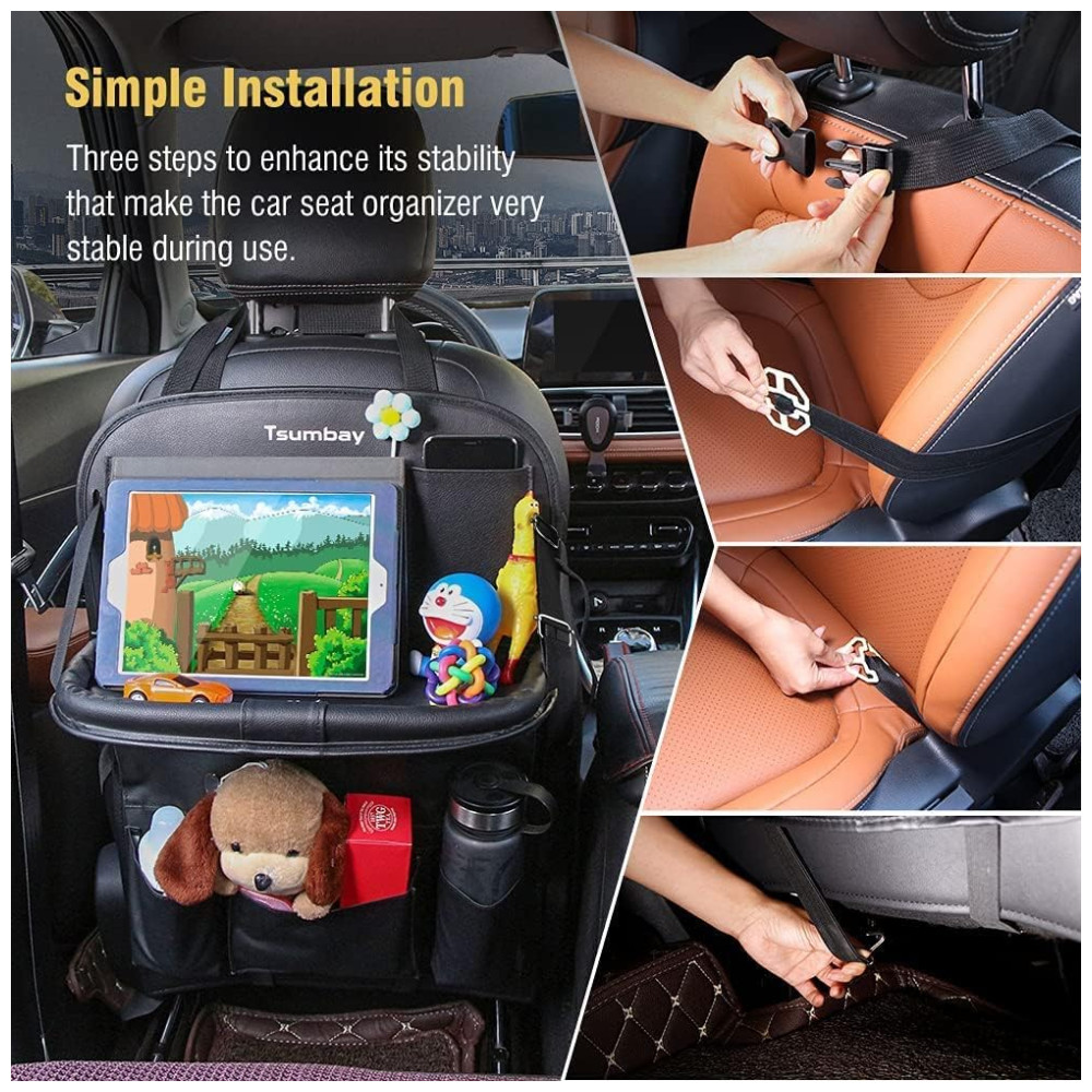 Couro sintético premium O organizador do assento de carro Tsumbay é feito de couro PU de alta qualidade com propriedade à prova dágua perfeita e boa durabilidade. Fazendo seu carro parecer muito luxuoso Além disso, protege a parte traseira da cadeirinha do carro contra poeira, abrasão e sujeira que chute.