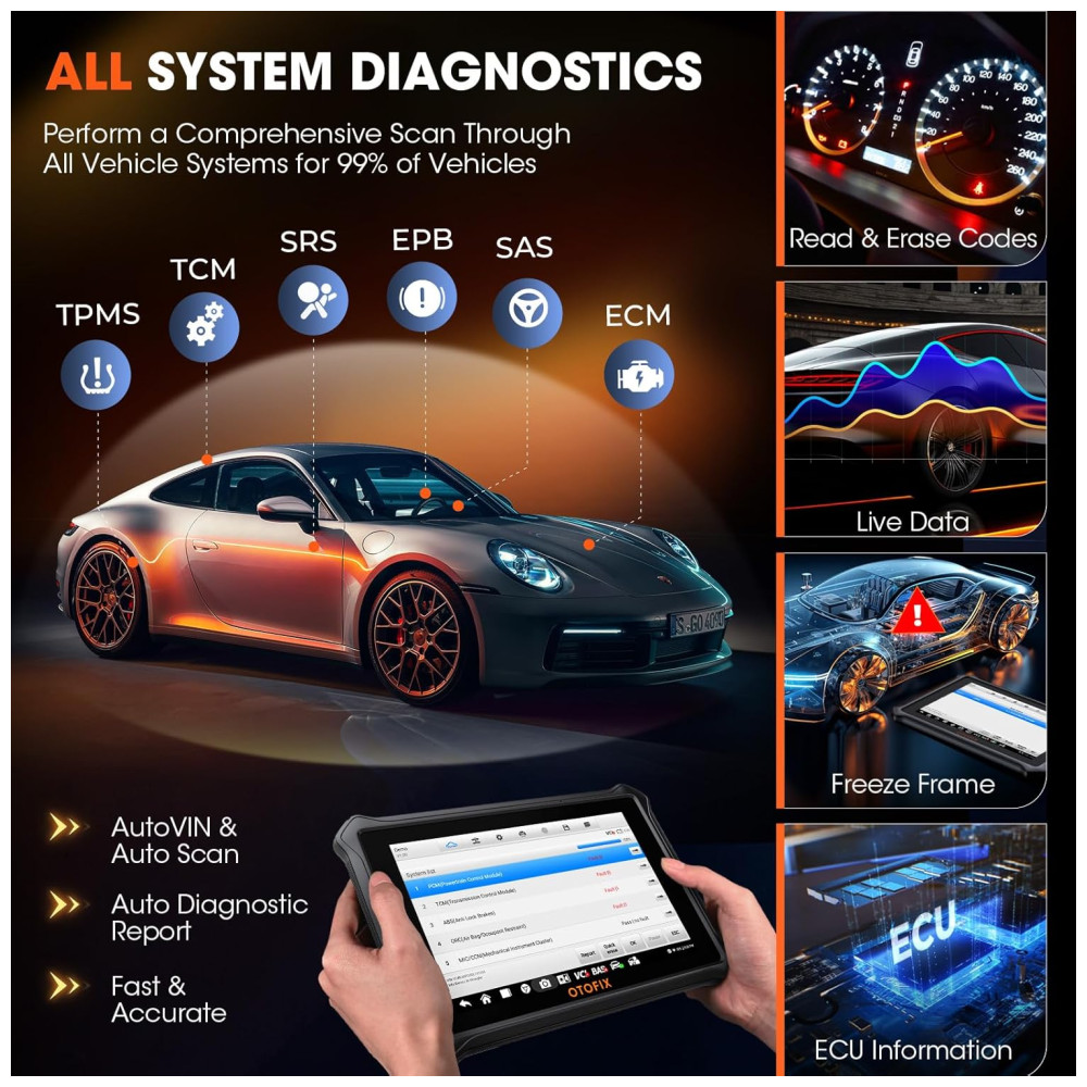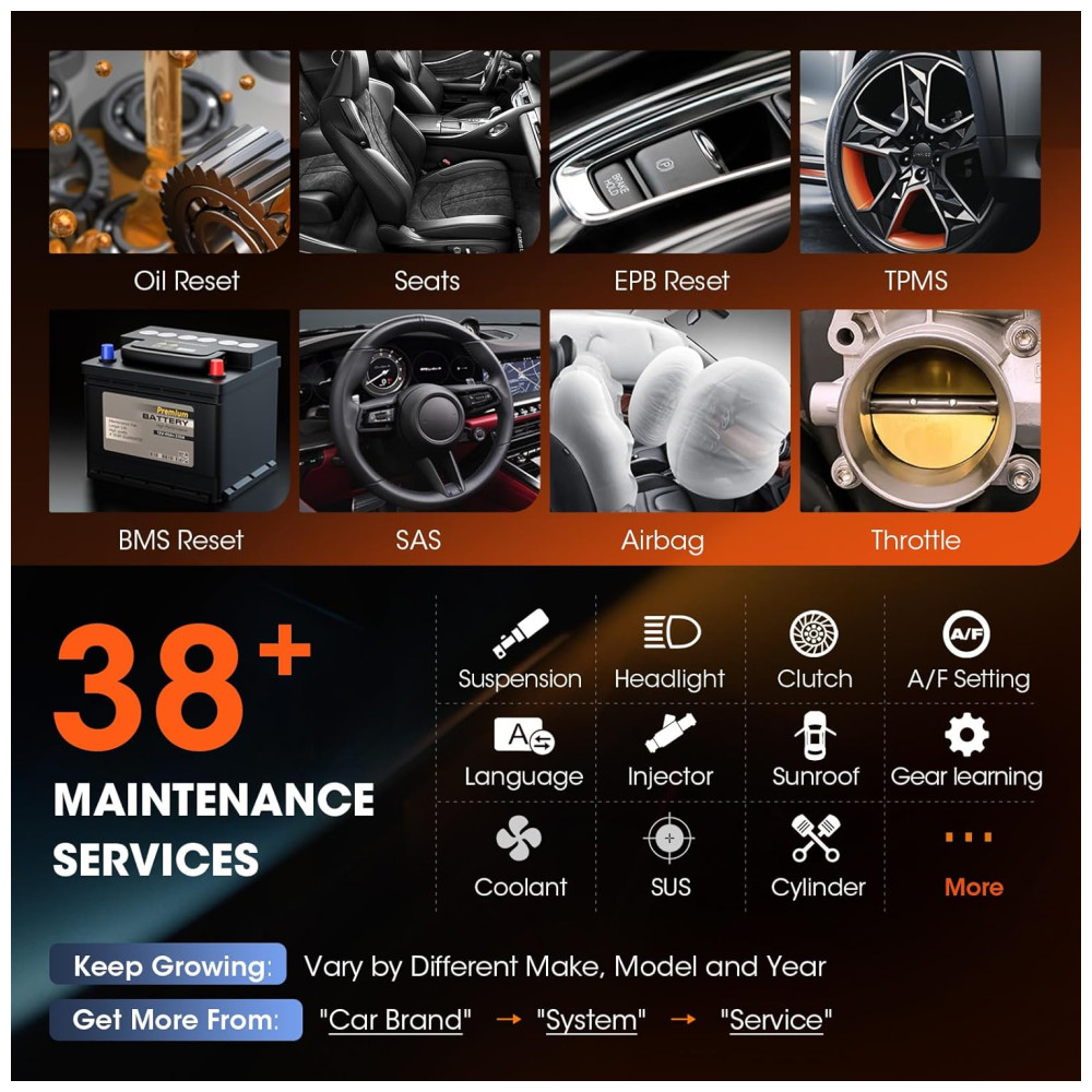 Ele suporta diagnóstico completo de todos os sistemas do veículo com protocolos CANFD e DoIP, além de oferecer mais de 38 funções de serviço, como purga do ABS, reset de óleo, codificação, programação de chaves inteligentes para veículos com sistemas IMMO de baixo nível, calibração de sensores, entre outras.