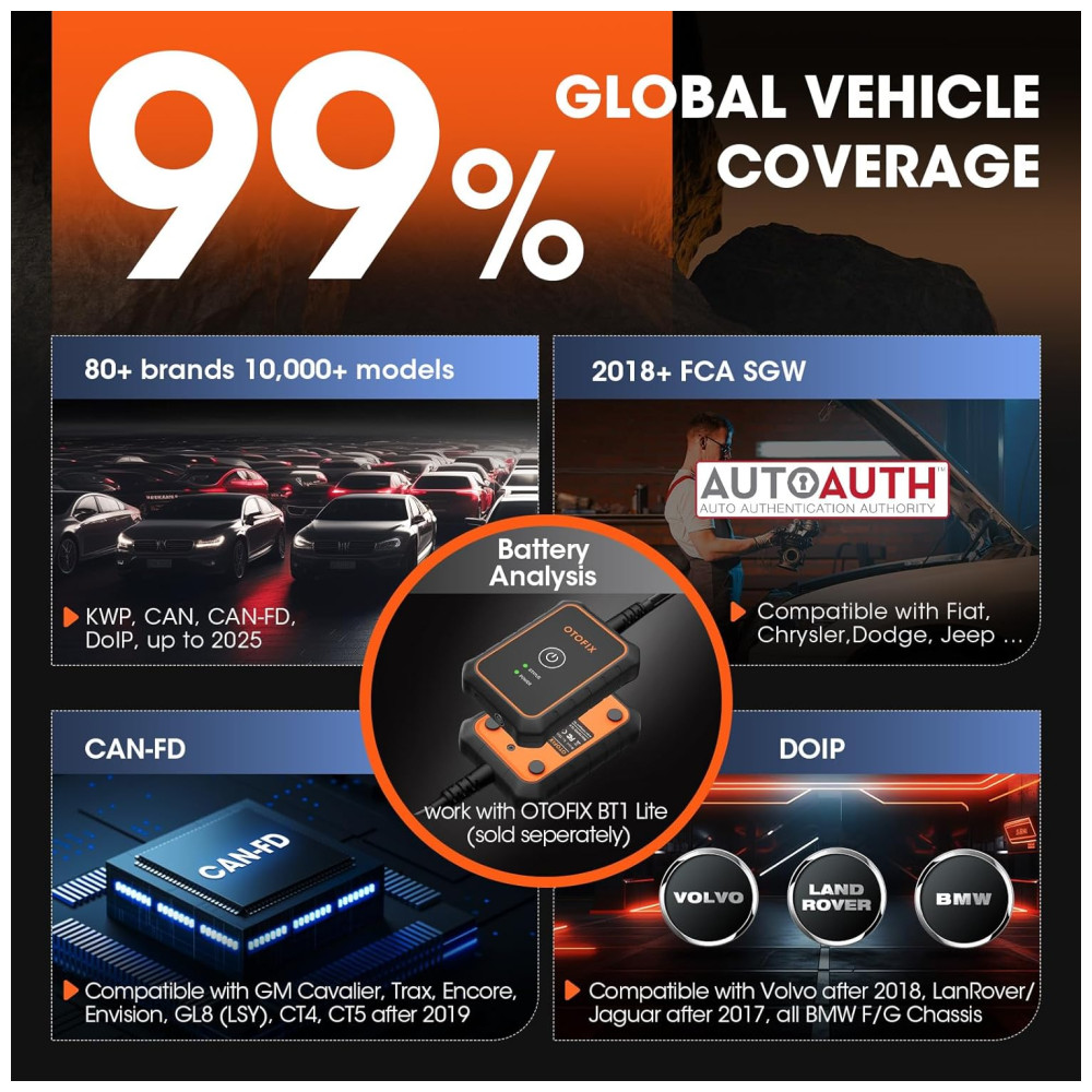 O scanner OTOFIX D1 Lite 2025 é compatível com cerca de 99% dos modelos de veículos dos mercados dos EUA, Europa e Ásia, incluindo marcas como GM (modelos Cavalier, Trax, Encore), Volvo (a partir de 2018), Land Rover e Jaguar (a partir de 2017), entre muitas outras.