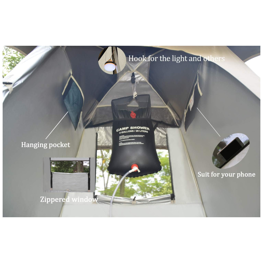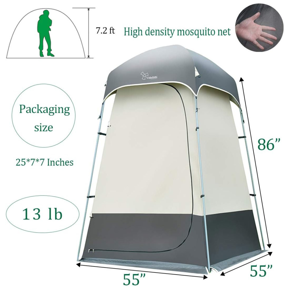 To Create Exclusive Private Courtyard in the nature. Whether in the forest, beach, or the lake, if you Take VIDALIDO tentyou will build your own private courtyard wherever you are. We share some outdoor equipment, and we also share the most romantic things and the most wonderful fun between friends. Behind each VIDALIDO tent in the shop, all come from satisfy and understanding of our lives, unselfish devotion in our lives. It is perfect for families or groups hiking and travel outdoor activites. Wherever you go, take this portable tent. The great privacy tent,offers a wide range of products covering outdoor activities of camping, hiking, travel, and leisure. It can give you a private place to change clothes, take shower, use restroom and etc. If you are a travle enthusiast or you like to go hiking with family and friends, you need it Specification Weight 13 pound, 5.5 kg Material Nylon Polyester, steel Dimensionpop open 55 w x 55 d x 86.5 h Dimensionfold flat 25 x 7x 7 Friendly reminder If you have any problem, please feel free send mail to us. We will try our best to help you timely. Clip for the water bag The shower tent have a clip for the water bag.Its can hold the weight of a 5 gallon. NOTE The water bags need to be purchased separately. Humanization Design The tent has a closed roof and non bottom design and with large zippered door with easy access. Good privacy protection You just need to take on the cover, private shelter for changing clothes is safety. Durable Material It has a mesh window on the one side of tent for seeing outside and ventilation. You just need to take off the cover to see outside through mesh