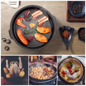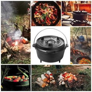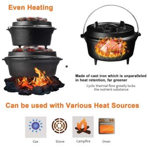Forno holandês versátil. As pernas integradas na panela e na tampa permitem que o forno assente perfeitamente sobre a fogueira a tampa também pode ser usada como frigideira para fritar. Além disso, os potes de ferro fundido não são revestidos com produtos químicos tóxicos. É uma superfície antiaderente segura.