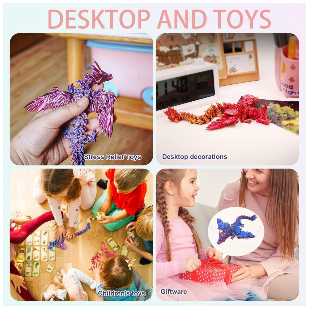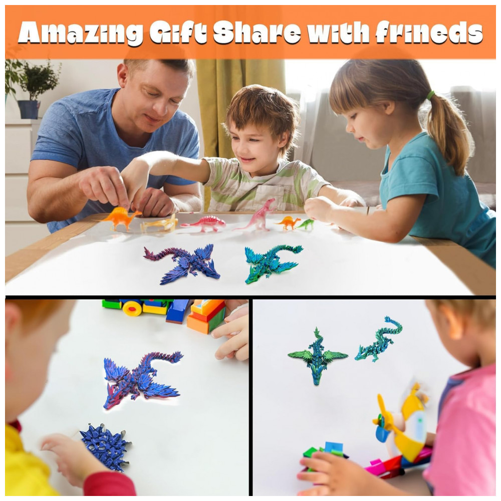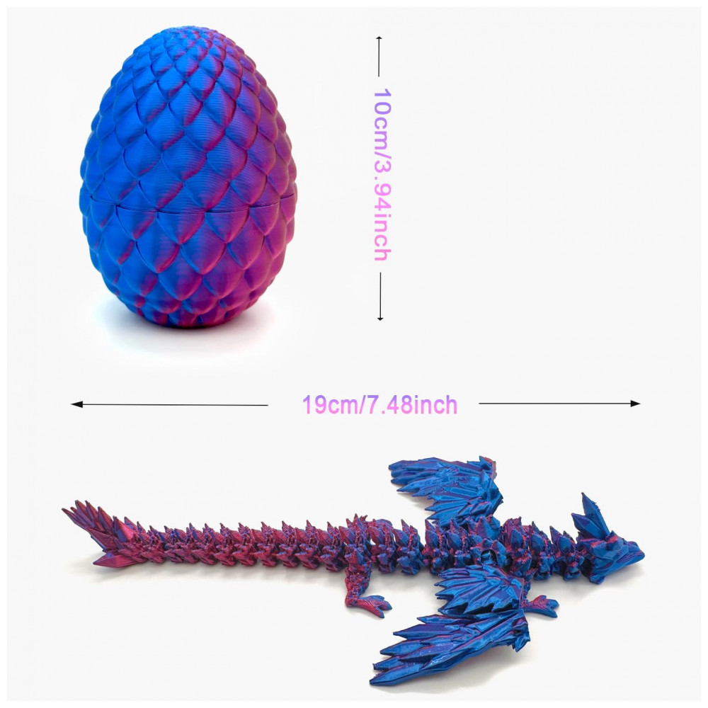 Este ovo de dragão é o brinquedo final para os amantes de dragões. Não é um brinquedo comum, pois vem com um Dragão flexível impresso em 3D escondido dentro do ovo. Tanto o ovo de dragão quanto o Dragão impresso em 3D são intrincadamente projetados com detalhes e cores deslumbrantes, tornando-os verdadeiras obras de arte. O Dragão de Cristal com Articulação Total! Possui um design completamente articulado, exibindo poses e movimentos realistas. Feito com um esquema de cores duplo, todo o seu corpo exibe um efeito de laser radiante, enquanto as asas podem torcer, dobrar e ajustar. Feito de PLA degradável, nossos brinquedos impressos em 3D são ecologicamente corretos, duráveis e inofensivos, com mais de cores diferentes para escolher, muito adequados para coleção. Nosso dragão de cristal articulado impresso em 3D oferece uma ampla gama de movimentos, permitindo que você crie poses dinâmicas e realistas que capturam a essência desta magnífica criatura. Este dragão voador seria um ótimo companheiro para crianças que amam criaturas mágicas. Perfeito para brincadeiras imaginativas, suas crianças adorarão tê-lo ao seu lado. Com seu brilho no dragão de cristal, ele parece impressionante e elas nunca se cansarão de sua beleza.