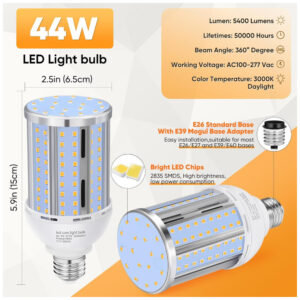 A Lâmpada de Milho LED XYCN de 44W oferece alta qualidade e eficiência. Com chips LED de alta qualidade, sistema de controle de calor e design de estrutura de resfriamento, possui mais de 55.000 horas de vida útil. Seu índice de reprodução de cores de 85 garante cores autênticas e vibrantes. Com potência de 44W, gera um brilho impressionante de 5.900 lumens, equivalente a uma lâmpada incandescente de 390W, proporcionando economia de energia de 85%. Com design sem ventoinha e dissipação de calor rápida, é perfeita para diversos ambientes como garagens, galpões, pátios, escolas, hospitais e muito mais.