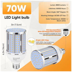 A Lâmpada de Milho LED XYCN é ideal para iluminação eficiente e duradoura. Com chips LED de alta qualidade, dissipação de calor eficaz e estrutura de resfriamento, tem vida útil de mais de 55.000 horas. Seu índice de reprodução de cor de 85 CRI garante cores fiéis e vivas. Possui driver LED isolado, garantindo estabilidade e longa vida útil. Com design sem ventilador e dissipação de calor rápida, seu foco de luz de 360 graus proporciona intensidade de 8.800 lumens, equivalente a um pequeno sol. Ideal para armazéns, garagens, jardins, supermercados, fábricas, estacionamentos, escolas, hospitais e iluminação de ruas. Com soquete E26/E39, ângulo de feixe de 360 graus e material resistente de alumínio. Não regule, não regue e não olhe diretamente para a luz. Pacote inclui 6 lâmpadas de 70W e 1 manual do usuário.
