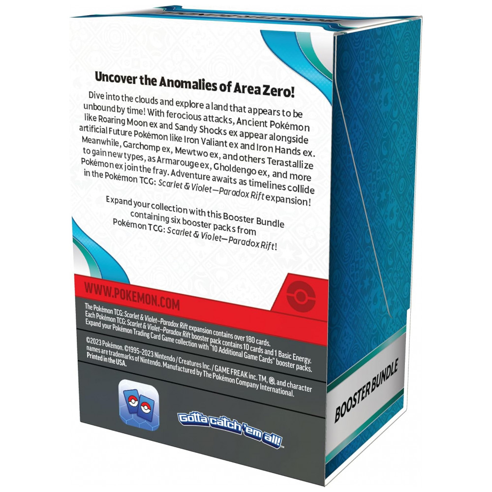 O Pokémon TCG: Scarlet & Violet – Paradox Rift Booster Bundle é um conjunto compacto da expansão Paradox Rift que reúne apenas boosters, sem acessórios extras, voltado a jogadores e colecionadores que querem ampliar a coleção com packs selados. A coleção explora o tema de Pokémon Ancestrais, como Roaring Moon ex e Sandy Shocks ex, ao lado de Pokémon Futuros, como Iron Valiant ex e Iron Hands ex, além de Garchomp ex e Mewtwo ex em formas Terastal com tipos alterados.