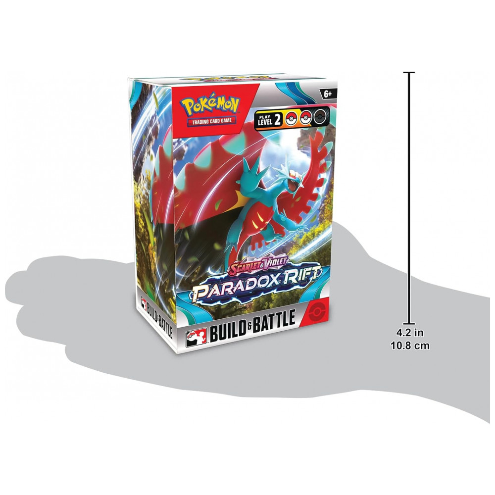 O bundle inclui 6 boosters Scarlet & Violet – Paradox Rift, cada um contendo 10 cartas e 1 carta de Energia básica, com cartas variando de pacote para pacote. É um formato recomendado para quem prefere investir diretamente em packs da expansão, sem caixas colecionadoras ou dados.